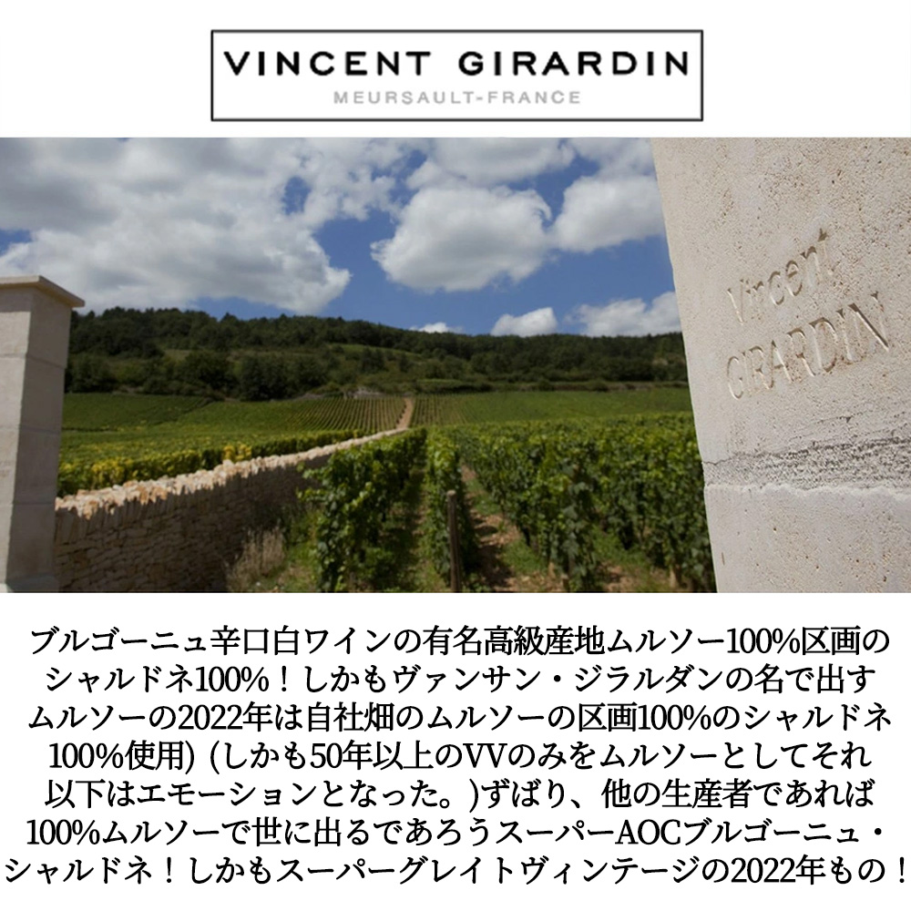 【商品説明】超希少!フランス・ブルゴーニュ辛口白ワイン愛好家大注目!の希少生産辛口白ワイン!しかもブルゴーニュ辛口白ワインの有名高級産地ムルソー100%区画のシャルドネ100%!しかもヴァンサン・ジラルダンの名で出すムルソーの2022年は自社畑のムルソーの区画100%のシャルドネ100%使用)(しかも50年以上のVVのみをムルソーとしてそれ以下はエモーションとなった。) ずばり、他の生産者であれば100%ムルソーで世に出るであろうスーパーAOCブルゴーニュ・シャルドネ!しかも2022VTは自社畑のムルソー100%!トップ・ドメーヌがクオリティを追求して造り上げるスーパーACブルゴーニュ・シャルドネ!しかもスーパーグレイトヴィンテージの2022年もの! キュヴェ・サン・ヴァンサンよりさらにリッチな味わい!マルコ・カスケーラ氏いわく「村名ワインのブラインド・テイスティングにこっそり出すと「素晴らしいシャサーニュですね」「素晴らしいムルソーですね」と言う方がおられます」! 造り手は、品質・評価ともに右肩上がりの稀有な才能を持つ造り手であり、ワイン造りの哲学は「畑はなるべく手を加え、醸造はできるだけ自然に、しかし設備はモダンに」を徹底する、世界的に有名なヴァンサン・ジラルダン!の手による味わいには酸味もしっかり感じられ、アロマも充分にありピーチやアプリコットなどの熟した果実全般のアロマが感じられる究極スーパー・ブルゴーニュ・シャルドネ“エモーション”が正規品で限定少量入荷!