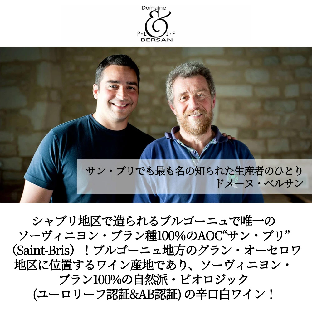 【商品説明】ブルゴーニュ辛口白ワイン愛好家大注目!シャブリ地区のソーヴィニヨンブラン種ファン大注目!シャブリ地区で造られるブルゴーニュで唯一のソーヴィニヨン・ブラン種100%のAOC“サン・ブリ”! (サン・ブリ(Saint-Bris)は、フランス・ブルゴーニュ地方のグラン・オーセロワ地区に位置するワイン産地であり、ソーヴィニヨン・ブラン主体の白ワインAOC(原産地呼称統制)の名前) (柑橘やフルーツの香り、ハーブ、ミネラル感が豊かで、爽やかかつしっかりした酸味のある辛口の白ワインで石灰質やキンメリジャン土壌が広がる土地の影響で、味わいにはシャブリと似たニュアンスやミネラル感が出ます。) しかも自然派・ビオディナミ (ユーロリーフ認証&AB認証) のヴァン・ナチュール! ソーヴィニヨン・ブランから造られるサン・ブリ。しかも偉大なスーパーグレイトヴィンテージのブルゴーニュの辛口白ワイン!大人気偉大なヴィンテージ[2022]年もので遂に少量入荷! しかも造り手はサン・ブリでも最も名の知られた生産者のひとりであり、アランメドウのバーガウンド他ワイン誌でも大注目!シャブリ、コート・ドーセール、サン・ブリ等に合計22haの自然派・ビオディナミ畑を所有のドメーヌ・ベルサン元詰白ワイン! (サン・ブリでも最も名の知られた生産者のひとり。2009年よりビオロジックに転換。2012年に認証を取得しています。ワインの熟成に最適な条件を備えた、11-12世紀に建てられたと言われるセラーを持ち、豊かな果実味とアロマを持つワインを造っています。現在はジャン ルイの後を継いだジャン・クリストフがドメーヌ運営の中心を担っています。) この2022年のサン・ブリ “モン・アンブラゼ”は手摘み収穫100%。ステンレスタンクで発酵、熟成は70%ステンレスタンク、30%樽で驚異の14ヶ月熟成。グレープフルーツやマンダリン、モモにハーブやスパイス、ヨードのニュアンスを感じる豊かな香り。いきいきとした果実とエレガントな酸味がバランスよく、引き締まった味わい。長く複雑な余韻が続きます。 もちろん現地のセラー数ヶ月前の蔵出し作品で正規品限定少量入荷!