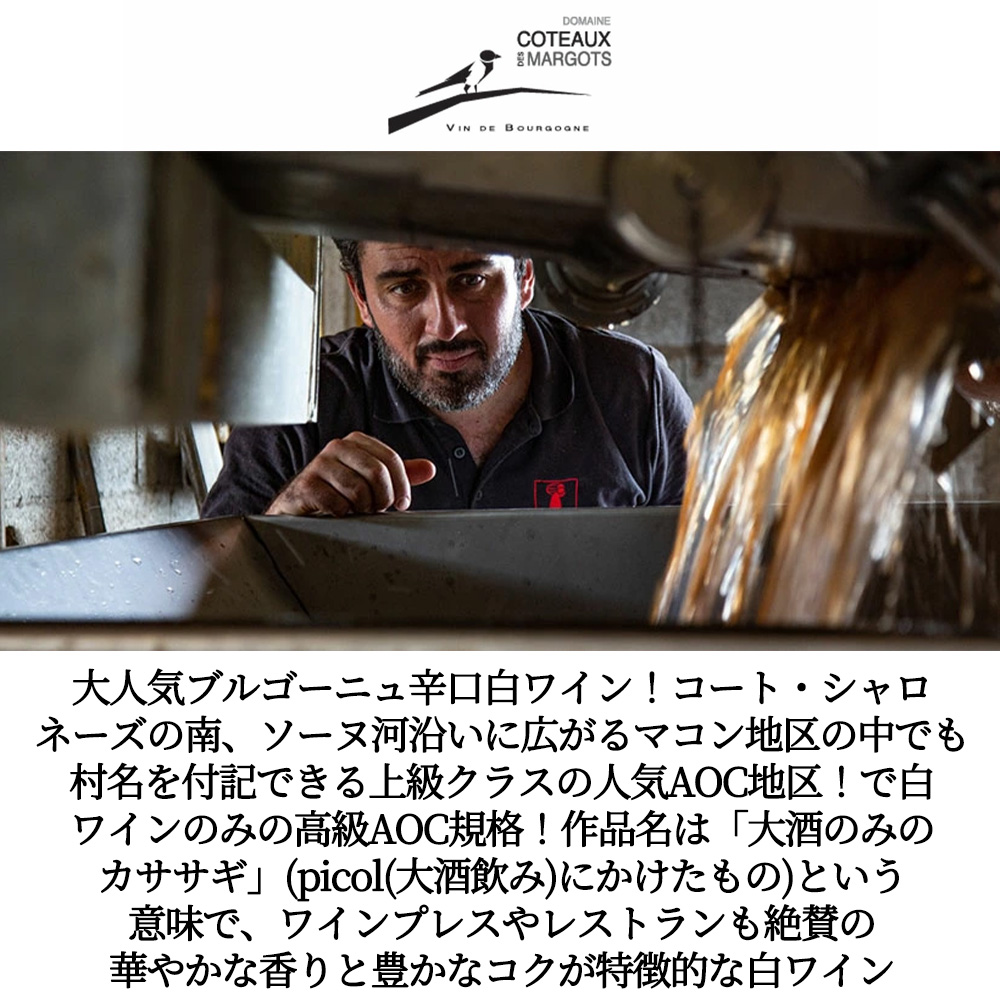 【商品名】マコン・ピエール・クロ・ラ・ピィ・コル(シャルドネ)[2023]年・蔵出し作品・ドメーヌ・コトー・デ・マルゴ元詰(ピエール・ジュリアン・デュルセ家)・ピエールクロ村のリウ・ディ「オー・モネ」と「オー・マルゴ」畑の樹齢驚異の50年のVV100%・(ワイン名「大酒のみのカササギ」)・AOCマコン・ピエールクロ・ブラン・樽醗酵&樽熟成・有機栽培・ビオロジック・HVE最高段階「レベル3」の認証【英名】Macon-Pierreclos La pie Col 2023 Domaine Coteaux des Margots (Pierre-Julien Duroussay) AOC Macon-Pierreclos