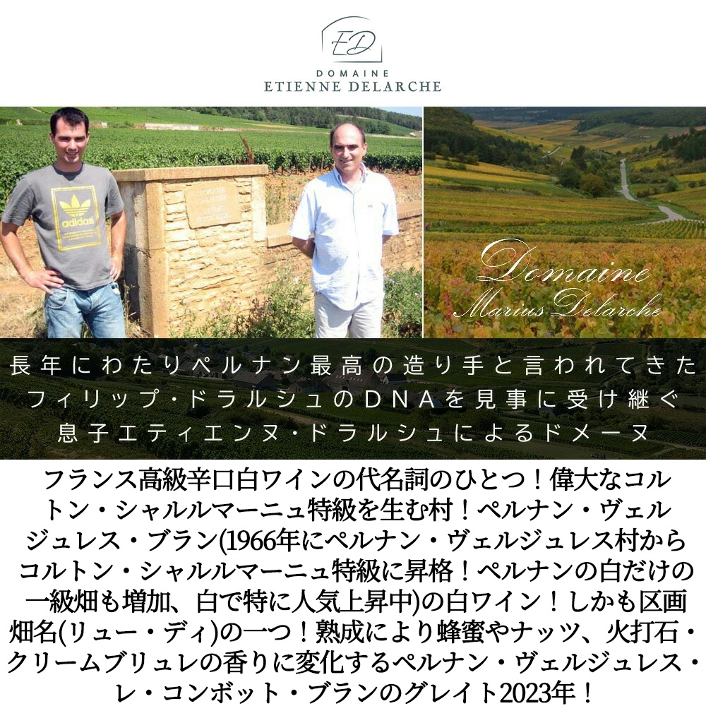 【商品名】ペルナン・ヴェルジュレス・レ・コンボット・ブラン[2023]年・蔵出し限定作品・ドメーヌ・エティエンヌ・ドラルシュ元詰・AOCペルナン・ヴェルジュレス・レ・コンボット・ブラン・石灰質土壌の平均樹齢35年のヴィエイユ・ヴィーニュのシャルドネを12ヶ月熟成(2020年以前はドメーヌ・マリウス・ドラルシュ)・有機栽培・ビオロジック(ECOCERTの認証)【英名】Pernand-Vergelesses Les Combottes Blanc 2023 Domaine Etienne Delarche AOC Pernand Vergelesses