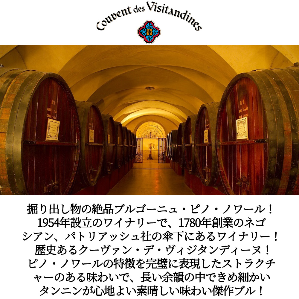 【商品説明】ブルゴーニュ辛口赤ワイン愛好家大注目!掘り出し物のブルゴーニュ・ピノ・ノワール100%辛口赤ワイン!しかもグレイトヴィンテージ[2021]年 (RVF誌2024年版でもブルゴーニュの赤に95点の最高評価&ワインアドヴォケイト誌でもコートドニュイの赤にの92点の高評価) でついに少量入荷! 造り手のクーヴァン・デ・ヴィジタンディーヌは1954年設立のワイナリーで、1780年創業のネゴシアン、パトリアッシュ社の傘下にあるワイナリー!その名は現在ワイン貯蔵庫として利用している17世紀建造の修道院に由来しています!アーチ状の天井を持つこの建物は見た目が美しいだけではなく、ワインの貯蔵庫としても最適な環境を提供してくれています!ワイナリーが築いてきたブルゴーニュ各地の栽培農家との幅広いネットワークと、整ったワイナリー設備をフルに活用し、ワイナリーが目指している「高品質ながら手ごろな価格のワイン」を生み出すため日々努力しています! このブルゴーニュ・ピノ・ノワール[2021]年は、厳選ピノ・ノワール100%をステンレスタンク醗酵!80%ステンレスタンク熟成、20%オーク樽熟成 (仏産、228L) で造られる本格派ブルゴーニュ・ピノ・ノワール!輝きのある深い赤色!赤果実、黒すぐり、ラズベリーのアロマ!ピノ・ノワールの特徴を完璧に表現したストラクチャーのある味わいで、長い余韻の中できめ細かいタンニンが心地よい素晴しい味わい!現在、2024年のブルゴーニュの不作とさらに円安の影響で今後この価格でのご案内はほぼ皆無だと思います!しかもグレイトヴィンテージ[2021]年もの!ブルゴーニュ・ピノ・ノワール愛好家はぜひ押さえて下さい!お急ぎ下さい!赤身肉のグリル、ローストポークやチキンソテーなどと良く合います!
