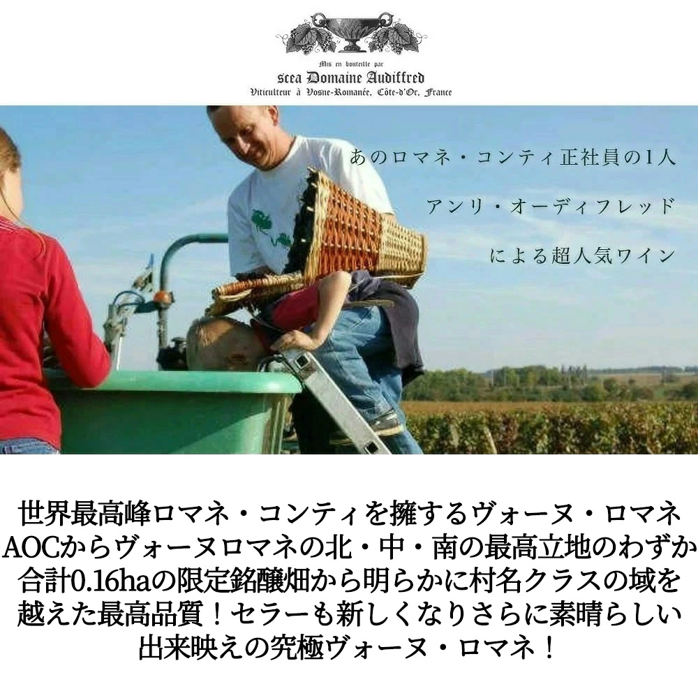 【商品説明】入手困難!高級ブルゴーニュ辛口赤ワイン愛好家大注目!ブルゴーニュで最もエレガントなワインを生む代表格と言われる至高の村!ヴォーヌ・ロマネ村!「ネックレスの中央の真珠」と評される珠玉のアペラシオン!ブルゴーニュの最高峰!世界の最高峰ロマネ・コンティを擁するヴォーヌ・ロマネAOC!! しかも愛好家待望のグレイトヴィンテージ[2023]年(しかも待望のグレイトヴィンテージ[2023]年 (RVF誌2026年版で95点の高評価!)でついに入荷!しかもヴォーヌロマネの北・中・南(北部の「レ・ヴィオレット」、中部の「オー・ヴィニュー」、南部の「オー・ドシュ・ド・ラ・リヴィエール」の3区画)の最高立地のわずか合計0.16haの限定銘醸畑!からの樹齢驚異の60年のV.Vのピノノワール100%から生み出されるワインは、テロワールを反映し、クオリティーの高さは定評中の定評! しかも造り手は、あのロマネ・コンティ(DRC)の12人の正社員のひとりだったアンリ・オーディフレッドによる、15ヵ月樽熟、ヴォーヌ・ロマネの人気キュヴェ!しかもグレイトヴィンテージ[2023]年!(RVF誌2026年版驚異の95点のグレイトヴィンテージ)で少量入荷! 過去、リアルワインガイド誌18号では「極めて正しいメンタリティを持った誠実な生産者が造る優しさと奥深さに満ちたハイクオリティなワイン」として特集記事!同誌22号では「各キュヴェとも生産本数は極めて少ない。人気アイテムの入手は容易ではないと思う。ゲットできる幸運を祈るしかないと思う」と大注目! わずか0.16haの自社畑の平均樹齢60年のV.Vの3つの銘醸畑からのいいとこ取りの超極上ピノ・ノワールを1-2回使用樽で15ヶ月熟成で造られる究極ヴォーヌ・ロマネ”!息子もドメーヌに参加、またセラーも新しい場所の新しいセラーに移転し盤石の体制 に!ワインもオーディフレッドらしいリッチさと果実味を持ちながら、それでいて生きたビロードのようなピュアでエレガントなタイプにさらに磨きがかかり、明らかに村名クラスの域を越えた最高品質! 素晴らしい出来映えの究極ヴォーヌ・ロマネが待望のグレイトヴィンテージ[2023]年で、現地のセラー数ヶ月前の蔵出し作品の素晴らしい状態で限定極少量入荷!