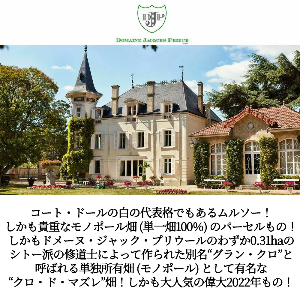 【商品名】ムルソー・“クロ・ド・マズレー・”(モノポール畑)・ブラン[2022]年・蔵出し作品・ドメーヌ・ジャック・プリウール元詰・手摘み100%・オーク樽驚異の20ヶ月熟成・マロ醗酵100%・(単独所有畑)・AOCムルソー・正規品・アランメドウのバーガウンド驚異の88-91点・重厚ボトル