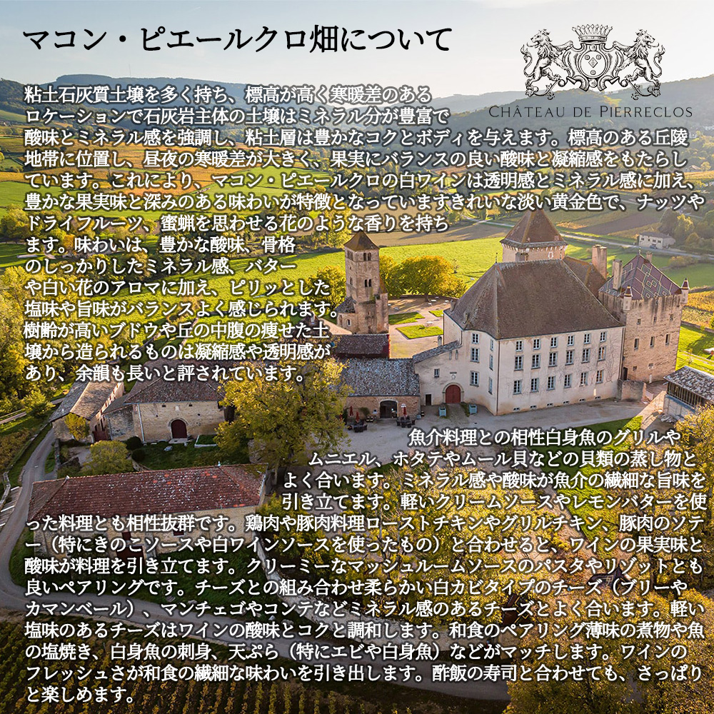 【商品名】マコン・ピエールクロ ・ブラン[2023]年・蔵出し限定作品・シャトー・ド・ピエールクロ元詰(5代目ジャン・マリー・ピドー氏)・AOCマコン・ピエールクロ・ブラン・重厚ボトル・自然派・有機オーガニック・ビオロジック(エコセール認証&ユーロリーフ認証)(畑で羊の放牧を実施)・アシェットガイド誌2026年版★星付き大注目・13%【英名】Macon Pierreclos Blanc 2023 Chateau de Pierreclos AOC Macon--Pierreclos Blanc BIO (Organic)