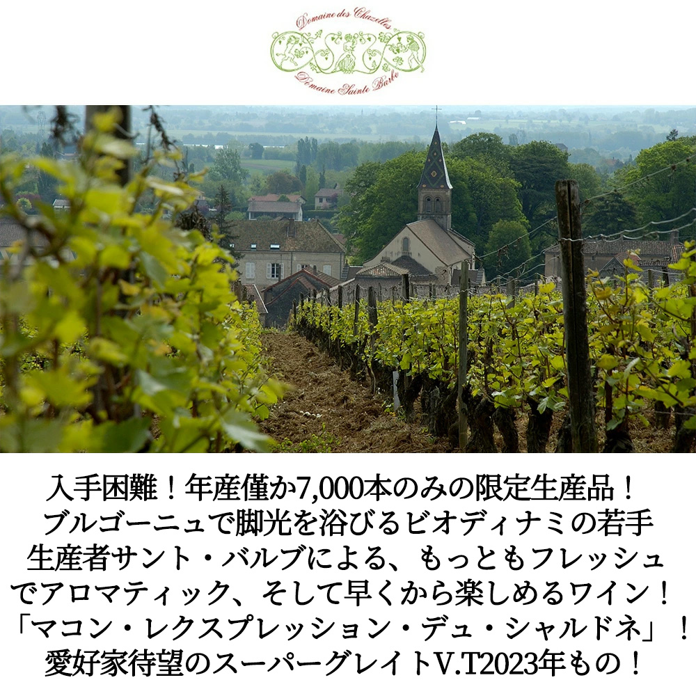 【商品説明】ブルゴーニュ辛口白ワイン愛好家大注目!自然派ビオディナミ(ビオロジック)愛好家大注目!年産わずか7,000本のみの限定生産品!しかもブルゴーニュ委員会による評価は『ワインは良質で、凝縮感とバランスに優れている。極端な暑さに見舞われた年であったというのに、新鮮な果実のアロマと躍動感が明るい未来を感じさせる、驚くべきヴィンテージとなった。白ワインは、その丸み、滑らかさ、そして複雑さで際立っている。リッチで非常に表情豊か、果実のアロマが過度にならずに存在感を示している。味わいでは、みずみずしい果実味とバランスの良さが生き生きと持続する。』と大絶賛! アシェット・ガイド誌2024年版でも18/20点を付けるスーパーグレイトジ[2023]年もので遂に少量入荷!この2023年でリアルワインガイド91号で「本当にこのワインにはいつも感心させられる。サント・バルブのエントリーワインなんだけど、「どこがエントリーだ!?」と思うクオリティの高さ。香りは華やかでいながら品があり、液体の質感はスタイリッシュでミネラリー。やはやです。」と激賞コメント! 造り手は、アシェット・ガイド誌でも星付大注目!ベタンヌ&ドゥソーヴでも星付大注目!リアルワインガイド誌他ワイン誌大注目!ブルゴーニュで脚光を浴びるビオディナミの若手生産者サント・バルブ!ブルゴーニュワイン専門誌「bourgogne Aujourd'hul」で大きく取り上げられ今やマコンの大御所を抑えてトップ生産者の1人に躍り出たジャン・マリー・シャラン氏によるもっともフレッシュでアロマティック、そして早くから楽しめるワイン!「マコン・レクスプレッション・シャルドネ」!上位のマコンの白ワインの名称であり、白ワインのみの高級AOC規格である“マコン・ヴィラージュ”AOC!ワイン評論家のヒュー・ジョンソン氏は「上位のマコンワインの包括名称!マコン・リュニ、ラ・ロッシュ、ヴィーヌズなど村名自体を使うこともある」と絶賛し、★★-★★★3つ星! ずばり毎年大好評のサント・バルブによるずばりマコン・ヴィラージュに位置し、共通の特徴を持つ畑から収穫された樹齢40年以上のシャルドネをブレンドして造り上げる、もっともフレッシュでアロマティック、そして早くから楽しめるワイン! 表層:粘土石灰質、深層:ジュラ紀の石灰石の畑からの樹齢40年のシャルドネ100%をステンレス・タンク熟成(一部オーク樽熟成)で11ヶ月で造られるこのワインは、透明感があり輝くようなイエロー!シトラスフルーツ、パイナップルなどの生き生きとした果実の香り!口当たりが良く、かつダイナミックなミネラル感にあふれた究極辛口白ワイン! マコン・レクスプレッション・デュ・シャルドネがスーパーグレイトヴィンテージ[2023]年で遂に入荷!