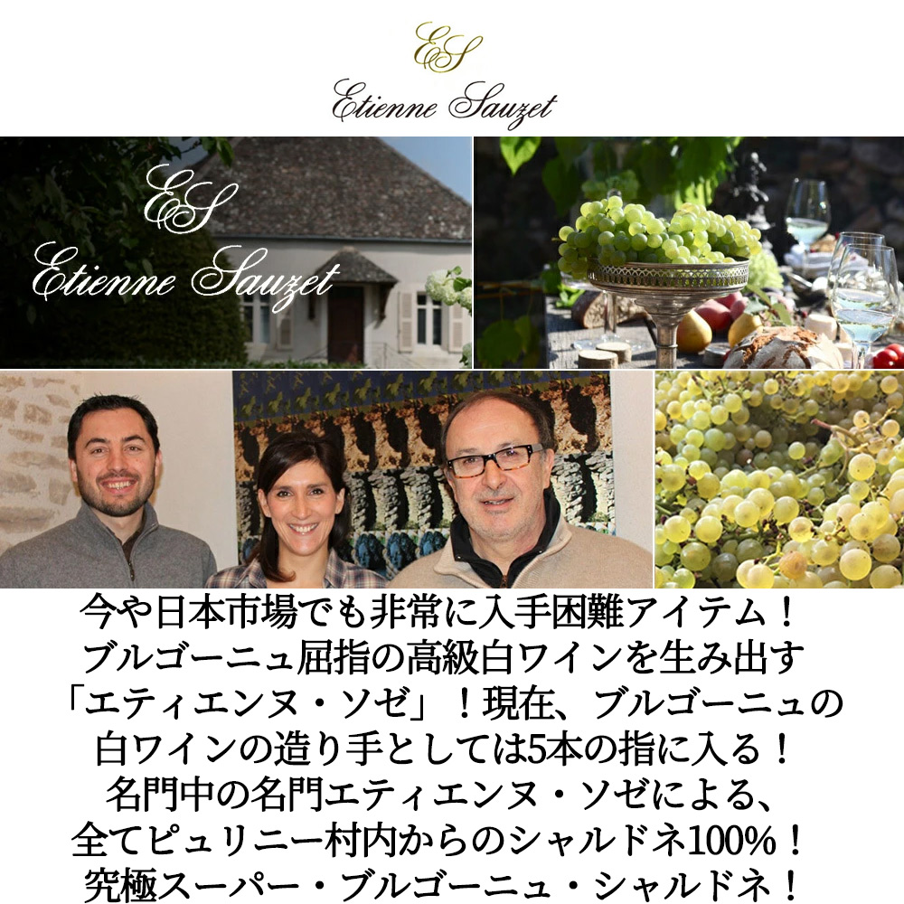 【商品説明】入手困難!大人気ブルゴーニュ辛口白ワイン愛好家大注目! ブルゴーニュ3大白ワインのひとつ!銘醸エティエンヌ・ソゼによるピュリニー・モンラッシェ村内のシャルドネ100%を使用したスーパー・ブルゴーニュ・ブラン! しかも大人気グレイトヴィンテージ[2023]年もの (アシェット・ガイド誌2026年版でも17/20点&RVF誌2026年版で94点) のグレイトヴィンテージ[2023]年もので遂に少量入荷! しかも造り手はブルゴーニュ屈指の白ワインを生み出す「エチエンヌ・ソゼ」!現在、ブルゴーニュの白ワインの造り手としては5本の指に入る、名門中の名門!特に世界最高峰白ワインの一つ!「ピュリニー・モンラッシェ」の中でも最も有名なドメーヌの一つ! 典型的なピュリニーのスタイルを造るソゼのワインは、世界中から注目の的となり、入手困難状態が続いています! 「ドメーヌの歴史は1903年にエティエンヌ・ソゼが畑を取得したことに始まる。彼は当時としては先進的な区画管理と品質重視の栽培を行い、ドメーヌの基盤を築いた。その後、娘婿であるジェラール・ブードが経営を引き継ぎ、名声を国際的なレベルへと押し上げた。現在はオーガニックおよびビオディナミ農法を積極的に取り入れ、自然と調和したワイン造りを実践している。エティエンヌ・ソゼのワインの最大の特徴は、純粋さと緊張感、そして精緻なミネラル感にある。樽香は控えめで、果実味、酸、土壌由来のニュアンスが高次元で調和している。醸造においては、過度な介入を避け、ブドウ本来の個性を最大限に引き出す姿勢が貫かれている。低収量、丁寧な選果、自然酵母の使用などにより、テロワールの違いを明確に表現。エティエンヌ・ソゼのワインは、単なる高級ブルゴーニュにとどまらず、土地・人・時間が生み出す芸術品とも言える存在である。その静謐で知的な味わいは、白ワインの究極形の一つとして、世界中の愛好家を魅了し続けている。」! このブルゴーニュ・シャルドネ[2023]年・エチエンヌ・ソゼはすべてピュリニー・モンラッシェの村内からのシャルドネ (ちなみに、このブルゴーニュ・ブランの畑はわずか0.76ヘクタールの希少畑!ちなみにピュリニー・モンラッシェはなんと3.34ヘクタール) をオーク樽熟成 (新樽10%) &ステンレスタンク熟成で造られる究極辛口白ワイン! 外観は輝きのあるレモンイエローの色調!グラスからは、リンゴや洋ナシ、ライムなどのフレッシュな果実香に、白い花、トーストしたナッツの香りが立ち上ります!口当たりは滑らかで、生き生きとした酸が、時間を経るごとにジューシーな果実味と美しく調和し、エレガントかつシャープな印象!余韻にはほのかに苦みのある柑橘系果実の風味が残る、上品で洗練された味わい!今や日本市場でも非常に入手困難!エティエンヌ・ソゼの傑作スーパー・ブルゴーニュ・シャルドネがグレイトヴィンテージ[2023]年で蔵出しで限定で少量入荷!