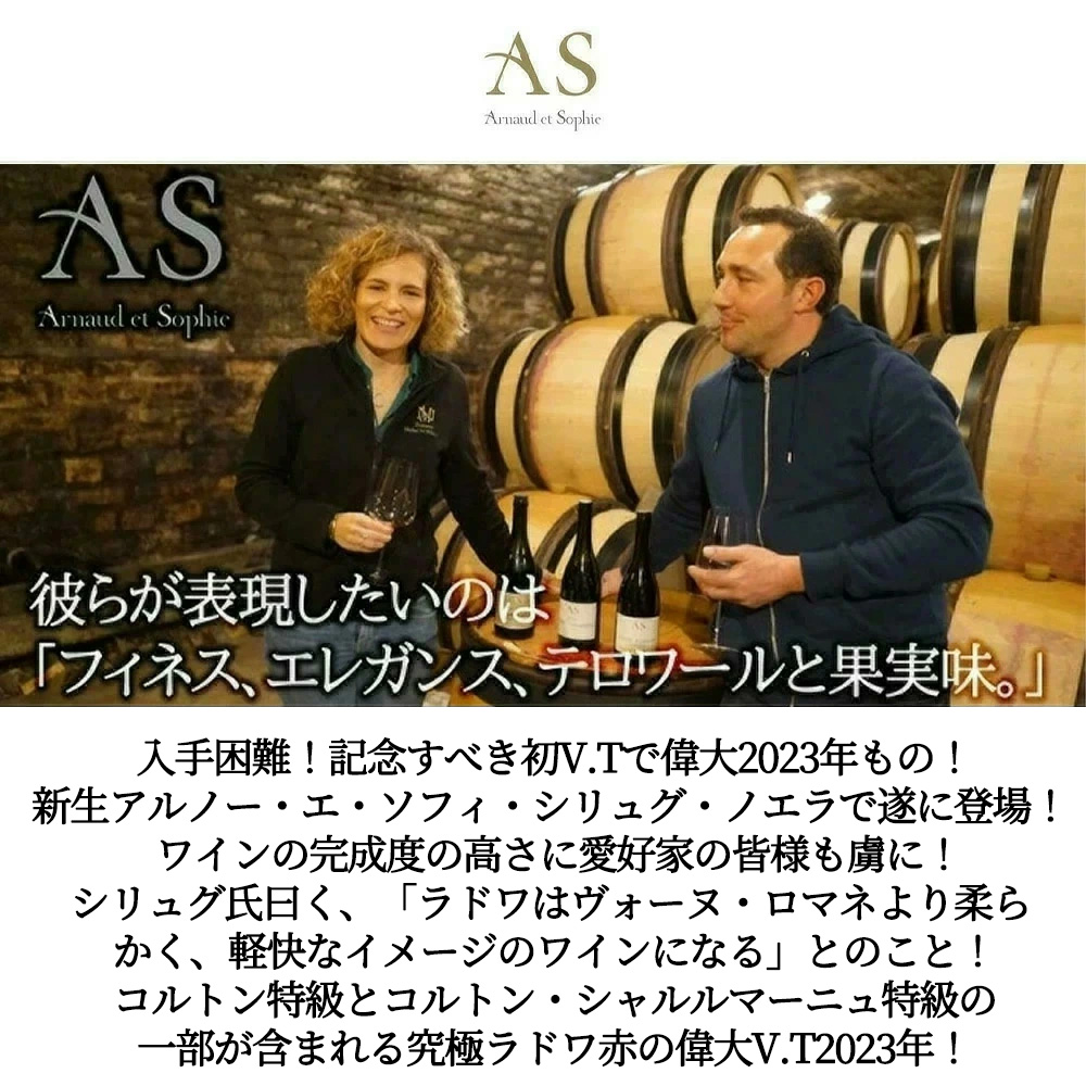 【商品説明】ブルゴーニュ辛口赤ワイン愛好家大注目!あのコルトン・グラン・クリュ特級とコルトン・シャルルマーニュ特級の一部が含まれる究極ラドワの赤!あのワイン評論家のマット・クレイマー氏に「アメリカでは、ラドワ・セリニを見かけることはめったにない。私はいつもブルゴーニュやパリのレストランのリストをさがすことにしている。必ずやお買得である」と絶賛させたラドワ・ルージュ! この2023年ヴィンテージから新生アルノー・エ・ソフィ・シリュグ・ノエラとして生まれ変わりました!日本にもアルノー・ソフィ夫妻が来日され、ワインの完成度の高さに愛好家の皆様も虜になられていました!しかも愛好家待望のスーパーグレイトヴィンテージ[2023]年 (アシェット・ガイド誌2026年版でもブルゴーニュの赤に17/20点&RVF誌2026年版で驚異の95点の偉大な年) !2022年まではドメーヌ・ロベール・シリュグとしてリリースされていましたが、父であるジャン=ルイ・シリュグが2022年に引退!ジャン・ルイの息子であるアルノー氏が完全にドメーヌを継承し、奥様ソフィー氏とのドメーヌである「アルノー&ソフィー・シルグー・ノエラ」に統一されました!しかもラドワAOCといえば、ボーヌの最高峰!特級コルトンを生み出す人気急上昇中のAOCとして定評!認知度の低いAOCですが、決して侮る事ができない名品です! このラドワ・ビュイッソンは、友人所有の僅か0.2haの畑からの希少作品で、これまで地元のみ販売でしたが、高需要に応える為、国外にも輸出開始した珍しい希少な1本!ジャン・ルイ・シリュグ氏曰く、「ラドワはヴォーヌ・ロマネより柔らかく、軽快なイメージのワインになる」とのこと!若いうちから柔らかで外交的なニュアンスが強い!適度な濃さとエレガントさが際立つ秀逸なワインに仕上がっています!ブラックチェリーなどのよく熟した黒果実や大地香、そしてそれに付随する旨味に満ちた果実味と香ばしくとても洗練された上質な樽のニュアンスがバランスよく溶け込んだ究極ラドワ・ビュイッソン!新生アルノー・エ・ソフィ・シリュグ・ノエラでリリースされる記念すべきファーストヴィンテージで、スーパーグレイトヴィンテージ[2023]年もの!愛好家垂涎の作品が、限定で蔵出しで極少量入荷!