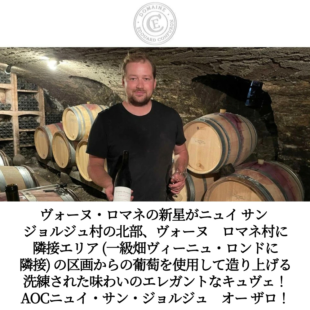 【商品説明】入手困難!ブルゴーニュ辛口赤ワイン愛好家大注目!ヴォーヌ・ロマネの新星がニュイ サン ジョルジュ村の北部、ヴォーヌ ロマネ村に隣接エリア (一級畑ヴィーニュ・ロンドに隣接) の区画からの葡萄を使用して造り上げるAOCニュイ・サン・ジョルジュ・オー・ザロ!堅牢なタンニンと粘りのあるストラクチャー、男性的なワインの代表格!がっしりとして開くのに時間がかかる長熟タイプとして知られる高級ニュイ・サン・ジョルジュにあってヴォーヌロマネのような非常に洗練された味わいを持つ赤ワイン!しかも愛好家待望のスーパーグレイトヴィンテージ[2023]年もの! (アシェット・ガイド誌2026年版でも17/20点の高評価&RVF誌驚異の95点の最高評価) でついに少量入荷! しかもヴォーヌ・ロマネの新星!「フランソワ・コンフュロン・ジャンドル」の当主フランソワの息子、エドワールが2021年に独立して立ち上げた新進ワイナリー。以下インポーターさんのコメントは『ヴォーヌ ロマネはラ ターシュ通り (Rue de la Tache) にワイナリーを構える「ドメーヌ フランソワ コンフュロン ジャンドル」。フランソワがドメーヌを引き継いだのは1984年のことです。弊社が輸入を開始したのは1997年で、28年目のお付き合いとなります。その住所の通り、ラ ターシュを始めとするグラン クリュが目と鼻の先にありますが、当主のフランソワはそんなことはお構いなしの「農夫」で、ワインの価格にも彼の性格が反映されています。フランソワのワインは原則として除梗し、しっかりとした抽出を行い、ヴィンテージの特徴をありのままに表現するスタイルです。それでいて高く評価されており、例えばマスター オブ ワインでブルゴーニュワインの権威として知られるジャスパー モリス MW は、フランソワの「エシェゾー グラン クリュ 2022」を 94-97 点と評価しています。 一方、「ドメーヌ エドワール コンフュロン」は、フランソワの息子エドワールが2021年に独立して立ち上げたワイナリーです。その動機は、「父とは違うワイン造りがしたかった」からだといいます。エドワールは1994年生まれ。2014年からフランソワ コンフュロン ジャンドルに参加しており、弊社が現地を訪問する際には、父のドメーヌと自身のドメーヌをエドワールがそれぞれ案内してくれます。『ワイナート111号』の特集記事「フランス ブルゴーニュのライジングスター」で紹介された際、エドワールは「父はタニックでストラクチャーのしっかりしたワインが好みなので、抽出の強いワインを造っています。僕はもっとフィネスの感じられるワインを造りたいんです」と話しています。ファーストヴィンテージの2021VTはあまりにも量が少なく、2022VTからの取り扱いとなりました。しかし、畑面積は約1.5haしかなく生産量もごくわずかのため、数量限定でのご案内となります。』 このニュイ・サン・ジョルジュ・オー・ザロ[2023]年・蔵出し作品・ドメーヌ・エドワール・コンフュロン元詰でアランメドゥ・バーガウンド驚異の89-91点の高評価獲得!絶賛コメントは『こちらもしっかりと煮詰められており、トーストの香りが強い。豊かで芳醇、そしてボディ感のある味わいは魅力的なテクスチャーを持ち、ダスティでバランスの取れた、そして長く続く余韻で、凝縮された力強さを存分に発揮する。今日はコンパクトなので、少し辛抱強く飲む必要があるだろう。2030年+ 89-91点』と大注目!ジャスパーモリスからも驚異の89-92点、ティム・アトキンからも92点獲得! 「オー・ザロ」はニュイ サン ジョルジュ村の北部、ヴォーヌ ロマネ村に隣接エリア (一級畑ヴィーニュ・ロンドに隣接) に位置しています。ダークチェリーを思わせるアロマ、非常に洗練された味わいがあります。ラズベリーのニュアンスに少しスパイスの要素が混ざります。程よい酸、きめ細かなタンニンが全体を支えています。土壌は砂利の多い堆積土壌です。収穫は手摘みで行い、全体の25%を全房発酵にしています。2023VTは25%を全房発酵させました。マロラクティック発酵が終わるまではSO2を添加しません。熟成はフレンチオーク樽で18ヶ月(新樽比率20-30%)行っています。ヴォーヌ ロマネの新星「エドワール コンフュロン」少量ながらついに待望のリリースを迎えました!もちろん正規品の素晴らしい状態で限定少量入荷!