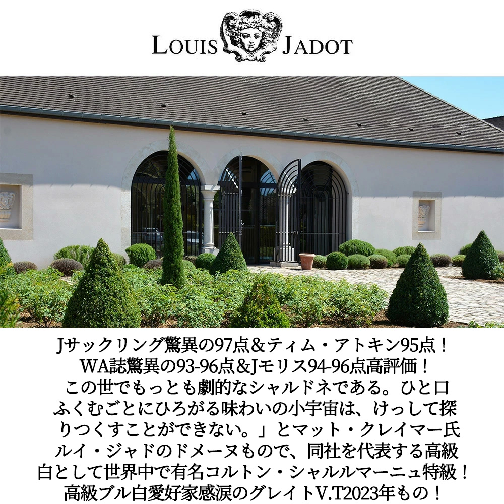 【商品名】コルトン・シャルルマーニュ・グラン・クリュ・特級[2023]年・蔵出し限定品・ドメーヌ・ルイ・ジャド元詰・正規品・超重厚ボトル・AOCコルトン・シャルルマーニュ・グラン・クリュ・特級・ジェームス・サックリング驚異の97点&ジャスパー・モリス94-96点&ワインアドヴォケイト93-96点&ティム・アトキン95点&バーガウンド91-94点