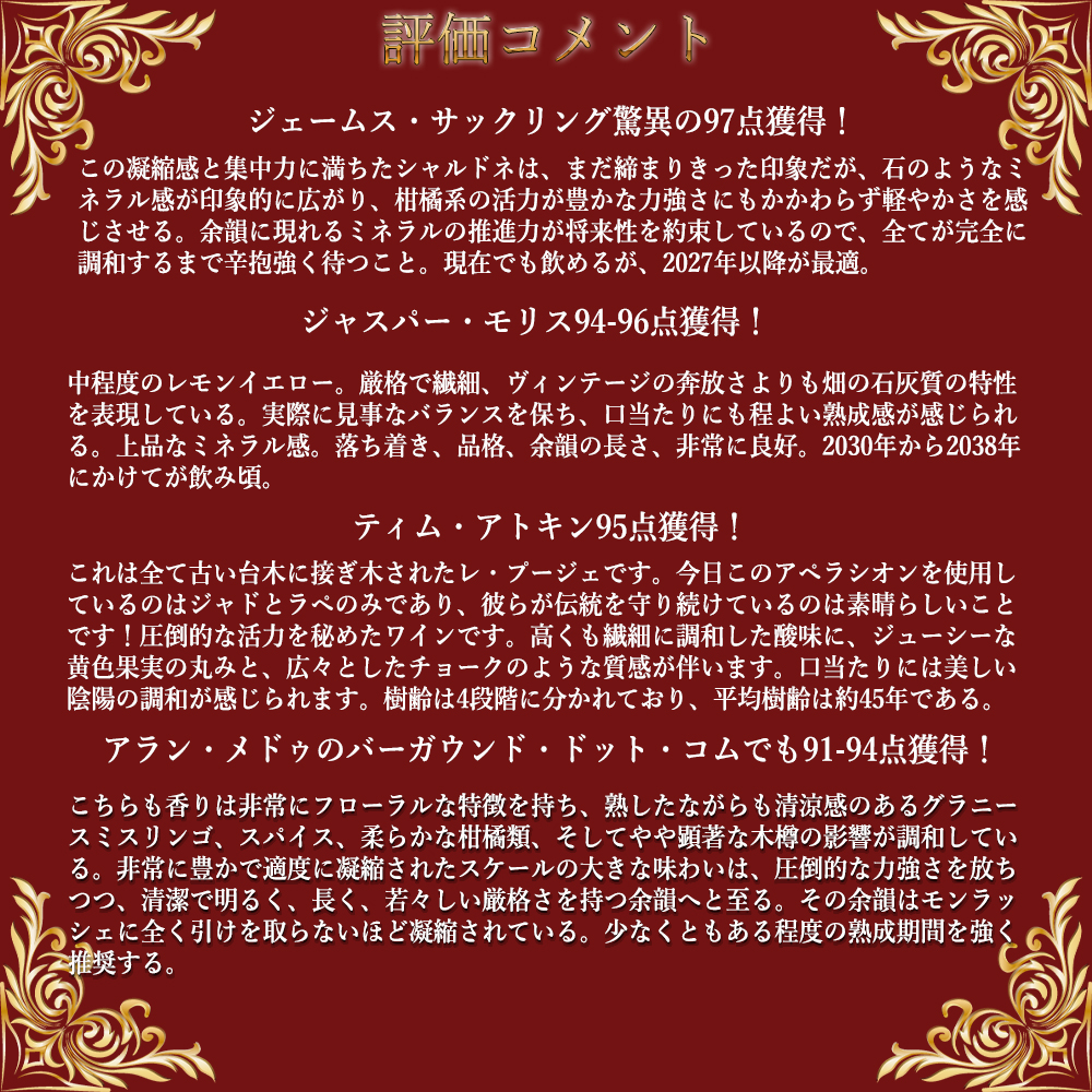 コルトン シャルルマーニュ グラン クリュ 特級 2023 蔵出し限定品 ドメーヌ ルイ ジャド元詰 正規品 超重厚ボトル JS驚異の97点 Corton Charlemagne Grand Cru 2023 Domaine desのレビュー