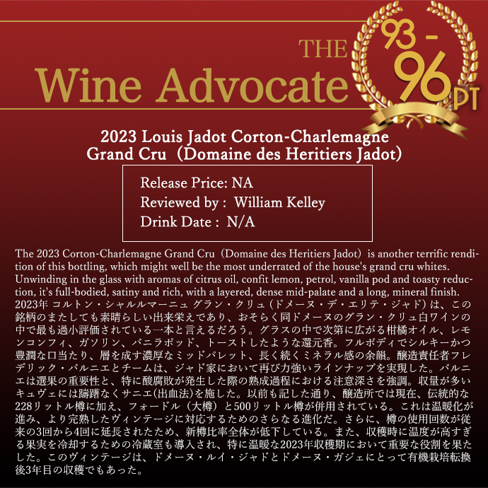【商品説明】希少!ブルゴーニュ高級辛口白ワイン愛好家大注目!毎年プリムール先売りでほぼ完売ワインが今年もプリムールで、しかも待望のグレイトヴィンテージ[2023]年!しかも大人気グレイトヴィンテージ[2023]年もの(アシェット・ガイド誌2026年版でも17/20点&RVF誌2026年版で94点) で遂に少量入荷!2大ブルゴーニュ高級辛口白ワインのひとつ!世界中で生産される白ワインのうち最上級のワインのひとつに挙げられるコルトン・シャルルマーニュ特級! 造り手はロバート・パーカー満点5つ星生産者であり、なんと!この大人気グレイトヴィンテージ[2023]年もののプリムールもので、ロバート・パーカー ワインアドヴォケイト誌で驚異の93-96点でコメントは「2023年 コルトン・シャルルマーニュ グラン・クリュ (ドメーヌ・デ・エリテ・ジャド) は、この銘柄のまたしても素晴らしい出来栄えであり、おそらく同ドメーヌのグラン・クリュ白ワインの中で最も過小評価されている一本と言えるだろう。グラスの中で次第に広がる柑橘オイル、レモンコンフィ、ガソリン、バニラポッド、トーストしたような還元香。フルボディでシルキーかつ豊潤な口当たり、層を成す濃厚なミッドパレット、長く続くミネラル感の余韻。醸造責任者フレデリック・バルニエとチームは、ジャド家において再び力強いラインナップを実現した。バルニエは選果の重要性と、特に酸腐敗が発生した際の熟成過程における注意深さを強調。収量が多いキュヴェには躊躇なくサニエ(出血法)を施した。以前も記した通り、醸造所では現在、伝統的な228リットル樽に加え、フォードル(大樽)と500リットル樽が併用されている。これは温暖化が進み、より完熟したヴィンテージに対応するためのさらなる進化だ。さらに、樽の使用回数が従来の3回から4回に延長されたため、新樽比率全体が低下している。また、収穫時に温度が高すぎる果実を冷却するための冷蔵室も導入され、特に温暖な2023年収穫期において重要な役割を果たした。このヴィンテージは、ドメーヌ・ルイ・ジャドとドメーヌ・ガジェにとって有機栽培転換後3年目の収穫でもあった。」! さらにジェームス・サックリング驚異の97点でコメントは「この凝縮感と集中力に満ちたシャルドネは、まだ締まりきった印象だが、石のようなミネラル感が印象的に広がり、柑橘系の活力が豊かな力強さにもかかわらず軽やかさを感じさせる。余韻に現れるミネラルの推進力が将来性を約束しているので、全てが完全に調和するまで辛抱強く待つこと。現在でも飲めるが、2027年以降が最適。」! ジャスパー・モリス94-96点でコメントは「中程度のレモンイエロー。厳格で繊細、ヴィンテージの奔放さよりも畑の石灰質の特性を表現している。実際に見事なバランスを保ち、口当たりにも程よい熟成感が感じられる。上品なミネラル感。落ち着き、品格、余韻の長さ、非常に良好。2030年から2038年にかけてが飲み頃。」! ティム・アトキン95点でコメントは「これは全て古い台木に接ぎ木されたレ・プージェです。今日このアペラシオンを使用しているのはジャドとラペのみであり、彼らが伝統を守り続けているのは素晴らしいことです!圧倒的な活力を秘めたワインです。高くも繊細に調和した酸味に、ジューシーな黄色果実の丸みと、広々としたチョークのような質感が伴います。口当たりには美しい陰陽の調和が感じられます。樹齢は4段階に分かれており、平均樹齢は約45年である。」! 今やパーカーを凌駕する勢いのアラン・メドゥのバーガウンド・ドット・コムでも91-94点でコメントは「こちらも香りは非常にフローラルな特徴を持ち、熟したながらも清涼感のあるグラニースミスリンゴ、スパイス、柔らかな柑橘類、そしてやや顕著な木樽の影響が調和している。非常に豊かで適度に凝縮されたスケールの大きな味わいは、圧倒的な力強さを放ちつつ、清潔で明るく、長く、若々しい厳格さを持つ余韻へと至る。その余韻はモンラッシェに全く引けを取らないほど凝縮されている。少なくともある程度の熟成期間を強く推奨する。」と大注目! 特にこのルイ・ジャドのドメーヌもののコルトン・シャルルマーニュ・特級(アロース・コルトン側のレ・プージョの畑のシャルドネ100%)は、同社を代表する高級白ワインとして世界中で有名!オーク樽で発酵&オーク樽で15ヶ月以上熟成! 力強く、ミネラルが豊富で、熟した果実と花、ペッパーやシナモンのスパイシーな香り!バランスの取れた重厚な辛口白ワイン! 「コルトン・シャルルマーニュはこの世でもっとも劇的なシャルドネである。ひと口ふくむごとにひろがる味わいの小宇宙は、けっして探りつくすことができない。ミネラルの風味は、ありあまるというより、おそいかかってくるようだ。」とマット・クレイマー氏に言わしめた究極辛口白ワイン!がようやくプリムールもので、しかも蔵出しの大人気グレイトヴィンテージ[2023]年もの!しかも正規代理店輸入品で極少量入荷!