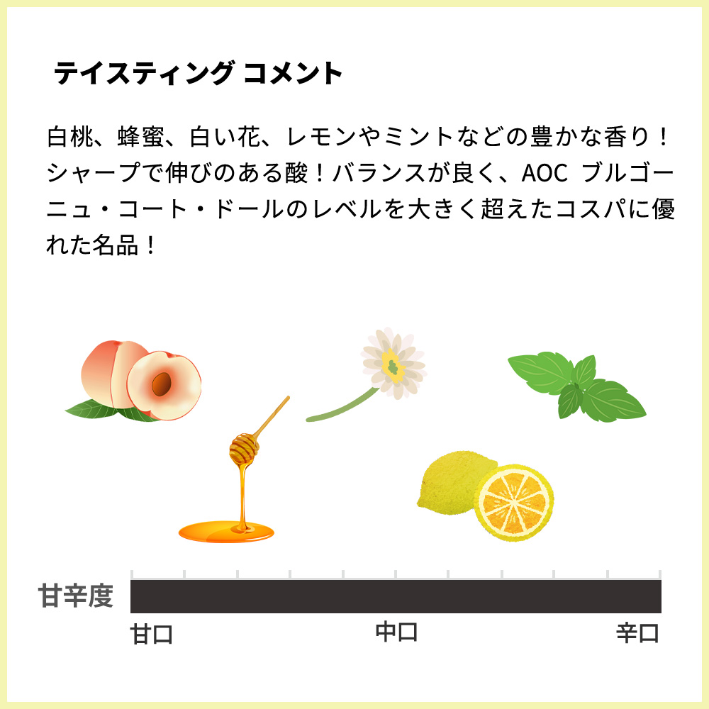 【商品説明】ブルゴーニュ辛口白ワイン愛好家大注目!高級ピュリニー・モンラッシェファンも大注目! 極少量生産の「偉大なブルゴーニュの辛口白ワイン」!しかも収穫量が激減した希少ヴィンテージ2024年もの!ブルゴーニュワイン委員会は「白と赤の両方で、美しい香りのプロファイルを備えた、表現力豊かでフルーティなワインが生まれた」と大注目し、生産者も『収穫量は激減したが、白ワインにとって素晴らしい年!』と絶賛する希少ヴィンテージで大人気[2024]年もの (2024年はブルゴーニュ全体でも厳しい年で、特に白は2023年比で40%減、2022年比では50%減となりました) がついに超限定入荷! INAO (原産地呼称委員会) によって2017年に新しく追加されたAOCブルゴーニュのさらに格上の村名AOC!2つの新しいAOCのひとつAOCブルゴーニュ・コート・ドール!シャルドネの特徴を素直に反映し、ミネラリーな高級ワインを産出する、世界的な辛口白の銘醸地!三大白ワインの銘醸地のひとつ!ピュリニー・モンラッシェ!そのピュリニー・モンラッシェ村内にあり、ピュリニー村で一番おいしいブルゴーニュ・シャルドネができると言われる、“シャンペリエ”という石が多い畑から産するシャルドネ100%で造られる (年によってはピュリニーの“格落とし”も使われる) 究極ブルゴーニュ・コート・ドール・ブラン! しかも造り手は、ワイン評論家のマット・クレイマー氏に「秘中の秘のごとき存在!」「ピュリニーの王者ルフレーヴと競うドメーヌ」と大絶賛させた、ドメーヌ・ポール・ペルノ!新樽は使用せず旧樽で熟成させ、果実味豊かでACクラスには見られない洗練された酸とバランスの良い凝縮感が売り!ピュリニー・モンラッシェクラスといっても過言ではない究極ブルゴーニュ・シャルドネ! 白桃、蜂蜜、白い花、レモンやミントなどの豊かな香り!シャープで伸びのある酸!バランスが良く、AOCブルゴーニュ・コート・ドールのレベルを大きく超えたコスパに優れた名品が、最新ヴィンテージ[2024]年で限定で極少量入荷!