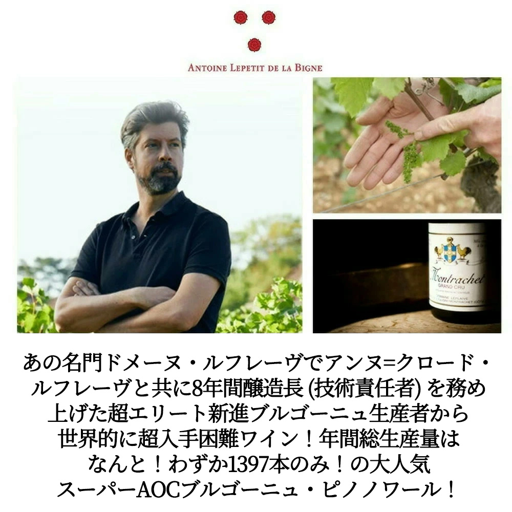 【商品名】ブルゴーニュ・ピノ・ノワール・ジューヌ・ヴィーニュ[2023]年・アントワーヌ・ルプティ・ド・ラ・ビーニュ(名門ドメーヌ・ルフレーヴの元醸造長)・自然派・ビオディナミ・古樽(70%)とアンフォラ(30%)10ヶ月熟成&ステンレスタンクで2ヶ月熟成の12ヶ月熟成・AOCブルゴーニュ・ピノ・ノワール・世界的に超入手困難ワイン・ロウ封印キャップ・(ボトルにナンバー入り)・RVF誌2026年版で星付き&高評価・アルコール度数驚異の12%・1397本のみ【英名】Antoine Lepetit de la Bigne / Bourgogne Pinot Noir Jeunes Vignes 2023 AOC Bourgogne Pinot Noir
