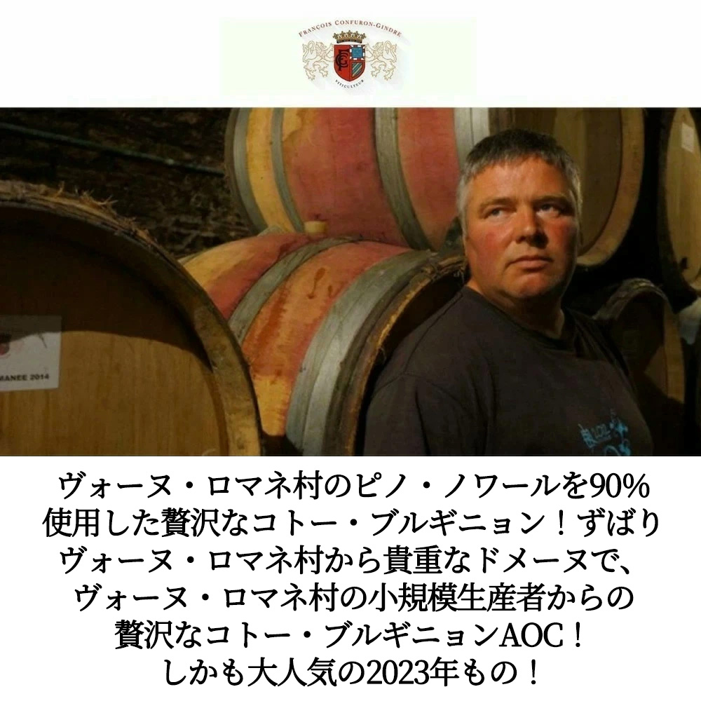 【商品説明】希少!入手困難!ブルゴーニュ辛口赤ワイン愛好家大注目!ヴォーヌ・ロマネ愛好家大注目!なんとヴォーヌ・ロマネ村のピノ・ノワールを90%使用した贅沢なコトー・ブルギニョン!しかも愛好家待望の大人気スーパーグレイトヴィンテージ[2023]年 (アシェット・ガイド誌2026年版でもブルゴーニュの赤に17/20点&RVF誌2026年版で驚異の95点の偉大な年) で待望入荷! ずばりヴォーヌ・ロマネ村から貴重なドメーヌで、ヴォーヌ・ロマネ村の小規模生産者!しかも生産量の90%がフランス国内で人気のためフランス国内の顧客に直行!海外市場にはほとんど出回らない“貴重なブルゴーニュワインとして有名!ドメーヌ・フランソワ・コンフュロン・ジャンドルによる新タイプの赤ワイン“AOCコトー・ブルギニョン”! AOCコトー・ブルギニョンはINAOが2011年11月に認定し、2011年ヴィンテージから適用された、ブルゴーニュ・グラン・オーディネールに代わりブルゴーニュを代表するワインとして位置づけされたAOCワイン!赤は、ピノノワール、ガメイ、セザールを使用でき、使用品種の割合に規定がないため、ブレンドの自由度が高く、ヴィンテージ (作柄) の良かった産地のブドウを中心に使えるのが強み!ヴォーヌ・ロマネ村のピノ・ノワールとガメイを使用!AOCコトー・ド・ブルギニョンは、ブレンド比率の規定はありませんが、このコンフュロンは、ピノ・ノワール主体 (85-90%) を使用し、しかもヴォーヌ・ロマネ村のピノ・ノワール100%使用で、その土地の特徴を表現! ジャスパーモリスでもこの2023年を高評価!今やパーカーをも凌駕する勢いの、アラン・メドゥのバーガウンド・ドット・コムでも過去ヴィンテージの2021年に『様々な赤いベリーのはっきりとした胡椒のようなノーズは、美味しく、力強く、きれいに正確な中量級のフレーバーにつながり、このジャンルの文脈の中では適度な深みと持続性を提供する。このマイルドで素朴なワインは、リリース後すぐに美味しく飲めるだろう。』と絶賛! ブラックベリーやブルーベリーを思わせるチャーミングなアロマ!酸と果実味のバランスが非常に良く、口当たりはシルクのようになめらかでやわらかく、それでいて親しみやすい味わい!フレッシュな果実味を保つため、ステンレスタンクで発酵、熟成!非常に洗練された贅沢な究極コトー・ブルギニョン・ルージュAOCが超限定でしかもスーパーグレイトヴィンテージ[2023]年もので極少量入荷!このレベルでこの価格はめったに見つけることが出来ないまさに傑作ブルゴーニュ!