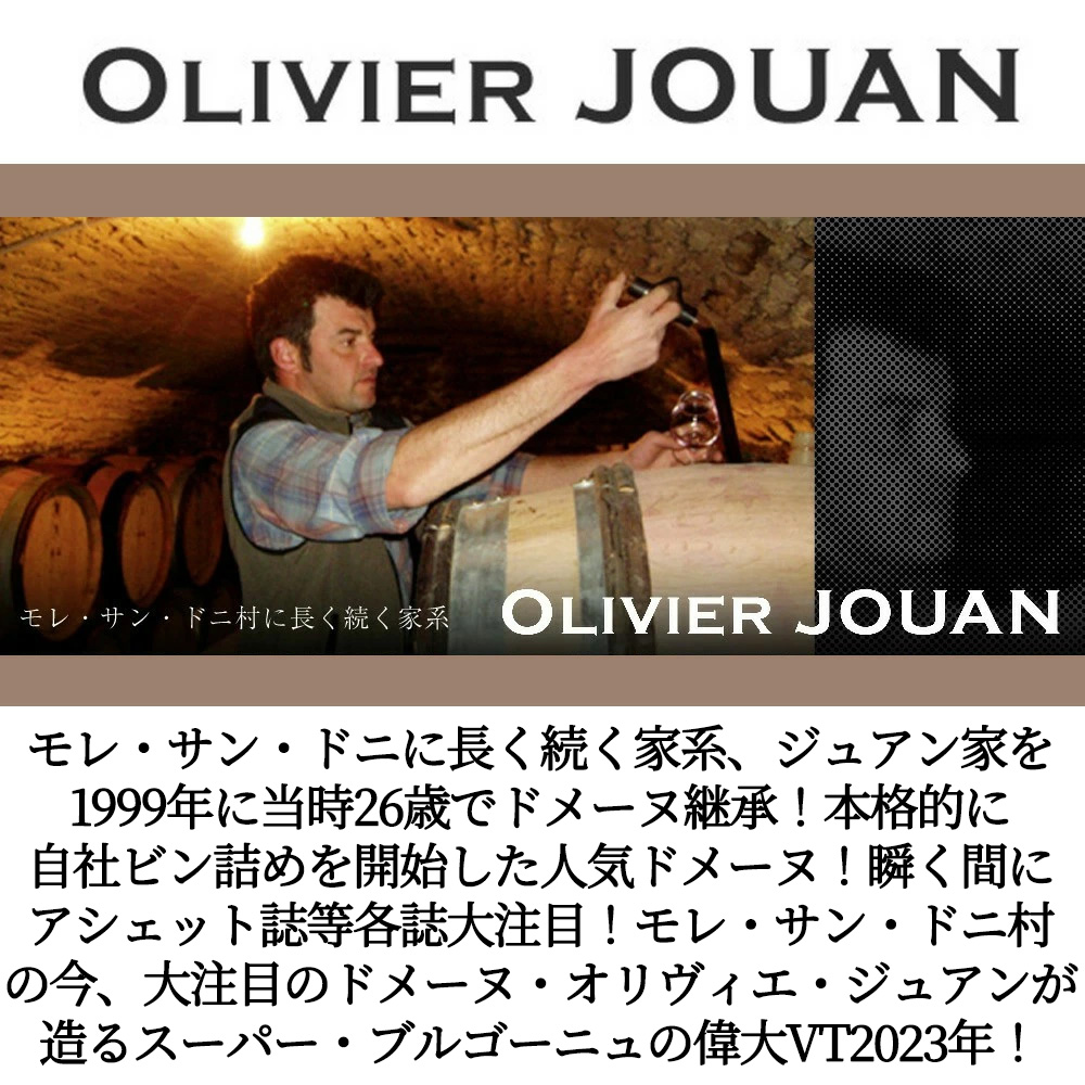 【商品説明】フランス・ブルゴーニュ辛口赤ワイン愛好家大注目! モレ・サン・ドニに長く続く家系、ジュアン家を1999年に当時26歳でドメーヌ継承!本格的に自社ビン詰めを開始した大人気ドメーヌ!瞬く間にアシェット・ガイド誌注目!「Bourgogne Aujourd'hui」誌注目!「リアルワインガイド誌」大注目!のモレ・サン・ドニ村の今、大注目のオリヴィエ・ジュアン氏が造るスーパー・ブルゴーニュ・ピノ・ノワール!しかも愛好家待望の大人気スーパーグレイトヴィンテージ[2023]年(アシェット・ガイド誌2026年版でもブルゴーニュの赤に17/20点&RVF誌2026年版で驚異の95点の偉大な年)で待望入荷! 自然派・ビオロジックのアルスナン村のオート・コート・ド・ニュイ区画(樹齢55-60年) 80%、「モレ・サン・ドニ・レ・クレ・ジロン」(樹齢約55年)10%、「モレ・サン・ドニ・レ・シャン・ド・ラ・ヴィーニュ」と地続きの同名ACブルゴーニュ区画(樹齢約65年)10%のブレンドで造られる古樹V.Vの究極スーパー・ブルゴーニュ・ピノ!新樽率20%で16ヶ月間樽熟成! このワインの2020年ブルゴーニュ・ピノ・ノワールにリアルワインガイド誌でも『2年前のこと。ブルゴーニュの18年ヴィンテージは濃くて強め。そしてオリヴィエ・ジュアンは黒くて濃いめで強め。こりゃ大変なことになるだろうと思っていたら、全く逆の柔かくてエレガントなワインだった。美味しかったなあ。そしてこの20年も濃くて強いヴィンテージ。さあどうなる。香りは黒くて濃い。けど、滑らかでしなやかないい香り。口に含むとやや濃いめながら滑らかで柔らかくてエレガント。やはりオリヴィエ・ジュアンはどんな年でも良いワインを造る。それぞれのヴィンテージ特性を生かしながら。酸もしっかり効いてジューシー。文句なし!』と大注目(今飲んで89点+&ポテンシャル90点+(今~2045年))! しかも待望のスーパーグレイトヴィンテージ[2023]年もので、しかも現地のセラー数ヶ月前、蔵出しで限定少量入荷!オリヴィエ・ジュアンの味筋をつかむのに最適の大人気AOCスーパー・ブル・ピノ!ぜひご堪能下さい!