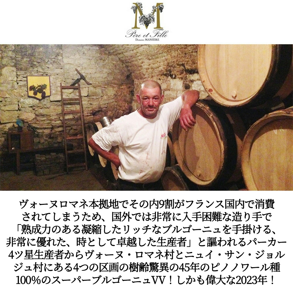 【商品説明】入手困難!ブルゴーニュ辛口赤ワイン愛好家大注目!なんと!ヴォーヌ・ロマネとニュイ・サン・ジョルジュの村にある4つの区画の樹齢驚異の45年のピノノワール種100%!で造られるスーパーブルゴーニュVV!しかもしかも愛好家待望の大人気スーパーグレイトヴィンテージ[2023]年 (アシェット・ガイド誌2026年版でもブルゴーニュの赤に17/20点&RVF誌2026年版で驚異の95点の偉大な年) ! 造り手はR・パーカー4ツ星生産者で「熟成力のある凝縮したリッチなブルゴーニュを手掛ける、非常に優れた、時として卓越した生産者」と謳われる日本では珍しい生産者。DRC社が切望するエシェゾーの区画『プーライエール』の中央部分の畑を所有。ドメーヌ・マニエールは、1795年からヴォーヌ・ロマネの村の中心に構える歴史ある造り手だ。現当主のリシャール・マニエールで5代目となる。先代の頃はマニエール・ノワロ名義でワインを手掛けており、ロバート・パーカーからは、「熟成力のある凝縮したリッチなブルゴーニュを手掛ける」というコメントともに4ツ星★★★★評価を得ている。因みにノワロはリシャールの母方の家系で、この一族はヴォーヌ・ロマネ最大の土地の所有者のひとりだった。 優れた畑 (ちなみに、先々代が手に入れたエシェゾーは、最上の区画のひとつ、レ・プーライエールのほぼ中央にある。ドメーヌ・ド・ラ・ロマネ・コンティの所有区画に両サイドを挟まれているため、同社から5年おきに畑の交換が持ちかけられるそう。) と評価がある一方、これまで無名の存在だったのは、ワインの大半をネゴシアンにバルク売りしており、ドメーヌの名を冠したワインが市場に出ることが絶対的に少なかったから。しかし、そのクオリティに感銘を受けたブルゴーニュのワイン商が「絶対に元詰めをしてドメーヌの名前でワインを世に出すべきだ」と、リシャールを説得。ようやく元詰め本数は増えたものの、その内9割がフランス国内で消費されてしまうため、国外で彼のワインに出会う機会は非常にまれ! このブルゴーニュ・ピノノワール[2023]年・ドメーヌ・マニエール・ペール・エ・フィーユ元詰は樹齢驚異の45年!しかもヴォーヌ・ロマネとニュイ・サン・ジョルジュの村にある4つの区画をブレンド!もちろんピノノワール100%でステンレスタンクで発酵後オーク樽のバリックで18ヶ月 (新樽10%) 熟成! 「熟成力のある凝縮したリッチなブルゴーニュを手掛ける、非常に優れた、時として卓越した生産者」と謳われるパーカー4ツ星生産者によるチェリーやカラント、ラズベリーなど粒の小さな果実のアロマ!滑らかな果実にくっきりとした酸を備えた実直な味わい!甘酸っぱい赤系果実が余韻に尾を引くスーパーブルゴーニュVV!の超お買い得赤ワイン!しかも偉大な2023年もので蔵出し作品で限定少量入荷!
