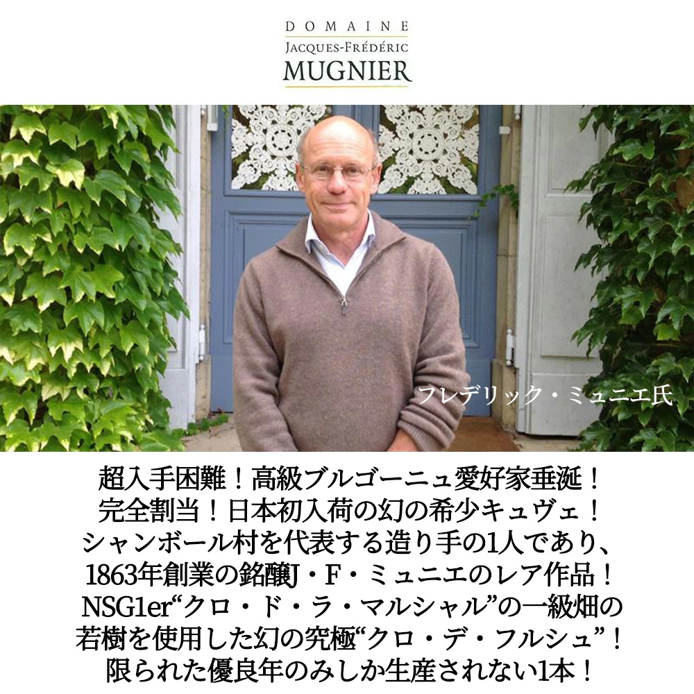 【商品説明】超入手困難!高級ブルゴーニュ大人気辛口赤ワイン愛好家大注目!今やブルゴーニュ愛好家憧れの希少ドメーヌ!しかも日本初入荷の幻の希少キュヴェ!優良年のみ生産される究極ニュイ・サン・ジョルジュ“クロ・デ・フルシュ”!しかも愛好家待望の大人気スーパーグレイトヴィンテージ[2023]年 (アシェット・ガイド誌2026年版でもブルゴーニュの赤に17/20点&RVF誌2026年版で驚異の95点の偉大な年) で遂に超限定入荷! あの『神の雫』にも登場の造り手!ワインプレスの評価でも高く、ワイナート誌55号では「デリケートさを醸し出すニュイ最南端のモノポール」と大特集!ベタンヌ&ドゥソーヴの「ル・グラン・ギド・デ・ヴァン・ド・フランス」誌で5B&Dマークの満点評価!ロバート・パーカー氏4つ星生産者!シャンボール・ミュジニー村を代表する造り手の一人であり、コント・ジョルジュ・ド・ヴォギエに次ぐミュジニー特級の第二の所有者!1863年創業の大人気ドメーヌ!ジャック・フレデリック・ミュニエ!によるプレモー・プリセ村に所有するコート・ド・ニュイ最南端のプルミエ・クリュであり、コート・ドール最大の単一所有畑モノポール“クロ・ド・ラ・マルシャル” (「元帥夫人」) からの最も樹齢の若いブドウ畑から優良年のみ生産する超希少作品“クロ・デ・フルシュ”! このクロ・デ・フルシュ畑はブルゴーニュのワイン産地マップで探しても見つかりません!この名称は19世紀末に魅力的な“クロ・ド・ラ・マレシャル”と改名された際にマップから消えました!フランソワ・ミュニエ氏は、かつての畑名を復活させることで、「クロ・ド・ラ・マレシャル」の中で区画や樹齢の違いによる個性を表現しようと考え、このキュヴェが誕生!クロ・デ・フルシュの歴史は、当時「Fourches (フルシュ) 」という名前は、絞首台、つまり犯罪者を吊るすための絞首台を連想させました!当然ながら、人々は「マレシャル (La Marechale) 」という、華やかで軽妙、そして祝祭的なオペレッタのような世界を想起させる名前の方を好むようになった歴史があります! 中身はクロ・ド・ラ・マルシャルの一級畑ながら、若木を使用しているため、しなやかで親しみやすく、開放的な香りと早飲みに適したスタイルに仕上がっています!ミュニエらしい繊細さとニュイ・サン・ジョルジュの芯の強さが美しく調和した味わいです!口に含むと、まずラズベリーや赤スグリ、熟し始めたチェリーの瑞々しい果実味が広がり、過度に主張しない酸が全体をきれいに支えます!タンニンは非常にきめ細かく、若いヴィンテージでありながら硬さは感じられず、シルキーで滑らかな質感を与えています!中盤にはほのかなスパイス、紅茶、スミレのニュアンスが重なり、ミネラル感が静かに輪郭を描きます!余韻は透明感があり、果実の甘やかな印象とともに土や石を思わせるニュイらしい風味が長く続き、エレガントで洗練された印象を残します!今飲んでも魅力的ですが、数年の熟成でさらに深みを増すことが期待できる一本! 限られた優良年のみしか生産されない銘醸ジャック・フレデリック・ミュニエの幻のNSG“クロ・デ・フルシュ”がグレイトヴィンテージ[2023]年で蔵出しの正規品で極少量入荷!