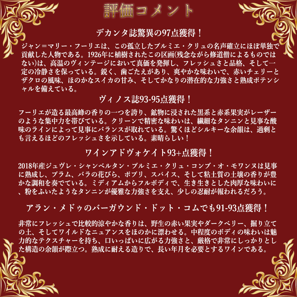 【商品説明】超入手困難!ブルゴーニュ辛口赤ワイン愛好家大注目!高級ジュヴレ・シャンベルタン愛好家垂涎!強いストラクチャーと優雅さを併せもつ、ブルゴーニュワインの王様!ジュヴレ・シャンベルタン村!の一級畑の中にあって、最上クラスの一級畑(カズティエ、ラヴォー、コンブ・オー・モワンヌ)に位置づけられる大人気畑“コンブ・オー・モワンヌ”ヴィエイユ・ヴィーニュ!しかもアシェットガイド誌2025年版が18/20点&ワインアドヴォケイト誌がブルゴーニュのニュイの赤に93点をつけるグレイトヴィンテージで飲み頃8年熟成バックヴィンテージの[2018]年ものが超限定入荷!日本市場でも希少で即完売する超人気アイテム! 造り手は、リアルワインガイド誌でも「フーリエのワインを入手出来た数少ない人へ心からおめでとうと言いたい」とコメントされるほど入手困難のドメーヌ・フーリエ!ジュヴレ・シャンベルタン村本拠地で、19世紀半ばから続く名門ドメーヌで、入手困難ドメーヌの一つ!現当主ジャン・マリー・フーリエ氏はあのブルゴーニュの伝統的造り手アンリ・ジャイエにワイン造りを教わり、その後、父親の元で修業をし、23歳という若さでドメーヌ・フーリエの5代目当主に!自ら“テロワリスト”と名乗り、高度な技術に頼らず、自然なワイン造りを実践!今や天才醸造家の呼び声高いジャン・マリー・フーリエ氏のドメーヌもの!“ドメーヌ・フーリエ”の究極ジュヴレ・シャンベルタン・プルミエ・クリュ!しかも力強いワインでよく熟成することで有名なコンブ・オー・モワンヌ!「昔から言われるのは、コンブ・オー・モワンヌは10年寝かせたあと、狩りの季節に飲むのがよく、それまでには豊かなジビエの風味が花開いており、タンニンを覆い隠してくれるからだという。」 この2018年のジュヴレ・シャンベルタン・プルミエ・クリュ・ラ・コンブ・オー・モワンヌでデカンタ誌驚異の97点でコメントは「ジャン=マリー・フーリエは、この孤立したプルミエ・クリュの名声確立にほぼ単独で貢献した人物である。1926年に植樹されたこの区画(残念ながら修道僧によるものではない)は、高温のヴィンテージにおいて真価を発揮し、フレッシュさと品格、そして一定の冷静さを保っている。鋭く、歯ごたえがあり、爽やかな味わいで、赤いチェリーとザクロの風味、ほのかなスイカの甘み、そしてかなりの潜在的な力強さと熟成ポテンシャルを備えている。」! ヴィノス誌93-95点でコメントは「フーリエが造る最高峰の香りの一つを誇り、鉱物に浸された黒系と赤系果実がレーザーのような集中力を帯びている。クリーンで精密な味わいは、繊細なタンニンと見事な酸味のラインによって見事にバランスが取れている。驚くほどシルキーな余韻は、過剰とも言えるほどのフレッシュさを示している。素晴らしい!」! ワインアドヴォケイト93+点でコメントは「2018年産ジュヴレ・シャンベルタン・プルミエ・クリュ・コンブ・オ・モワンヌは見事に熟成し、プラム、バラの花びら、ポプリ、スパイス、そして粘土質の土壌の香りが豊かな調和を奏でている。ミディアムからフルボディで、生き生きとした肉厚な味わいに、粉をふいたようなタンニンが優雅な力強さを支え、少しの忍耐が報われるだろう。」! さらに今やパーカーを凌駕する勢いのアラン・メドゥのバーガウンド・ドット・コムでも91-93点でコメントは「非常にフレッシュで比較的涼やかな香りは、野生の赤い果実やダークベリー、掘り立ての土、そしてワイルドなニュアンスをほのかに漂わせる。中程度のボディの味わいは魅力的なテクスチャーを持ち、口いっぱいに広がる力強さと、厳格で非常にしっかりとした構造の余韻が際立つ。熟成に耐える造りで、長い年月を必要とするワインである。」と大注目でSweet Spot Outstandingの高評価!ジャンシス・ロビンソン女史大注目! 1928年植樹の超古樹のピノ・ノワール100%で造られる高級ジュヴレ・シャンベルタン銘醸1級畑“ラ・コンブ・オー・モワンヌ”!ドメーヌ・フーリエの非常に希少なグレイトヴィンテージ[2018]年!当店入荷も極少量!皆様お急ぎ下さい!