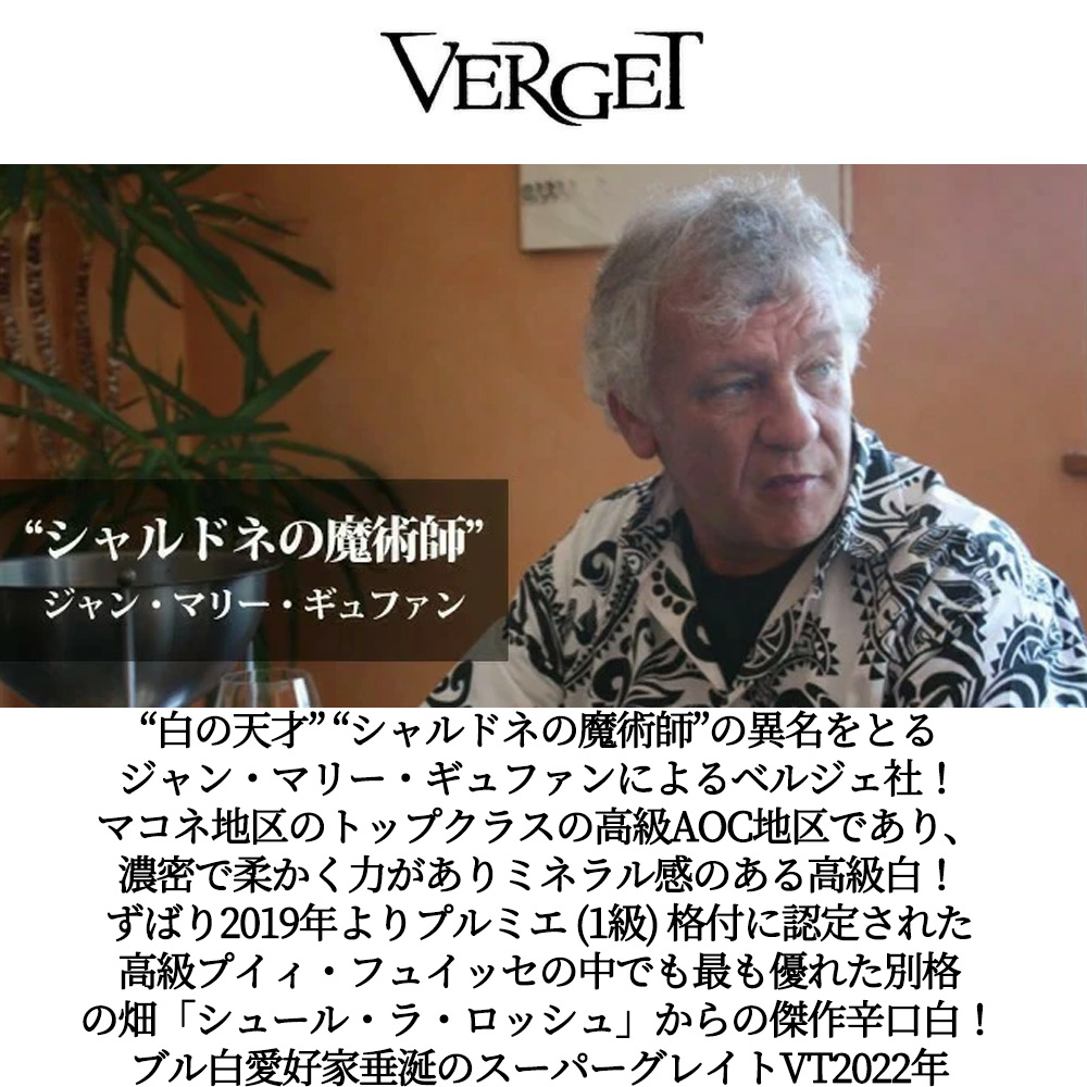 【商品説明】希少!高級ブルゴーニュ辛口白ワイン愛好家大注目!高級プイィ・フュイッセ愛好家垂涎! 「マコン地区のトップクラスの高級AOC地区であり、濃密でやわらかく力がありミネラル感のあるワイン」「マコン地域で最良の辛口白ワイン!濃密で力強い傑出した辛口白はコート・ドールの最上のものと太刀打ちできる」と言われる高級AOCプイィ・フュイッセ! しかも2019年よりプルミエ・クリュ格付けとなったヴェルジッソン村の石灰分を含んだプイィ・フュイッセでも最も優れた区画の1つ「シュール・ラ・ロッシュ」! しかも大人気スーパーグレイトヴィンテージ[2022]年! (ブルゴーニュ委員会による評価は『ワインは良質で、凝縮感とバランスに優れている。極端な暑さに見舞われた年であったというのに、新鮮な果実のアロマと躍動感が明るい未来を感じさせる、驚くべきヴィンテージとなった。白ワインは、その丸み、滑らかさ、そして複雑さで際立っている。リッチで非常に表情豊か、果実のアロマが過度にならずに存在感を示している。味わいでは、みずみずしい果実味とバランスの良さが生き生きと持続する。』と大絶賛!アシェット・ガイド誌2024年版でも18/20点を付けるスーパーグレイトヴィンテージ) が遂に入荷! しかも造り手はブルゴーニュ・マコネ地区単独トップ生産者!「白ワインの天才」の異名をとり、繊細で洗練された、卓越した味わいのワインを産出し、ロバート・パーカー氏には、満点★★★★★5つ星生産者にあげさせ、「八方、手を尽くしても探さずにはおられない珠玉のようなドメーヌ」と絶賛!フランス・R.V.F誌でもマコンで唯一の最高評価満点★★★3つ星を獲得するドメーヌ・ギュファン・エナンが、これまた1990年より始めたメゾン・ベルジェ社(R.V.F誌では、このメゾン・ヴェルジェもブルゴーニュのメゾンとしては最高の★★2つ星を獲得) 1980年にベルギーより移り住み、マコンの醸造学校でワイン造りを学んだ後に小さなドメーヌを購入し、持ち前の芸術的才能を活かし白ワインをリリース!“シャルドネの魔術師”の異名をとるジャン・マリー・ギュファンの手による大人気プイィ・フュイッセ“シュール・ラ・ロッシュ”!ヴェルジッソン村の石灰岩の岩盤の上にある別格の畑と大注目を受けるフュイッセの中でも最も優れた区画の1つ!しかもヴェルジェの中でも最もミネラルに富んだワイン!“シュール・ラ・ロッシュ”の厳選シャルドネ100%!ファーストプレスの葡萄のみ使用し、フレンチオーク樽新 (樽25%) にて12月下旬まで発酵!その後、7ヶ月木樽で熟成!その後、セメントタンクで澱とともに寝かせリリースされるプイィ・フュイッセの最高級白! 燻製された香り、桃、ラズベリーなどの果実香!スケールは大きく、ミネラルが際立つ!ギュファン・エナン氏も「ヴェルジェで最も美しい白で、成功したワイン」と大絶賛!力強さではなく美しいミネラルと驚くべきリッチさ、そして素晴らしいバランスの究極辛口白ワインが大人気スーパーグレイトヴィンテージ[2022]年で正規品で限定少量入荷!
