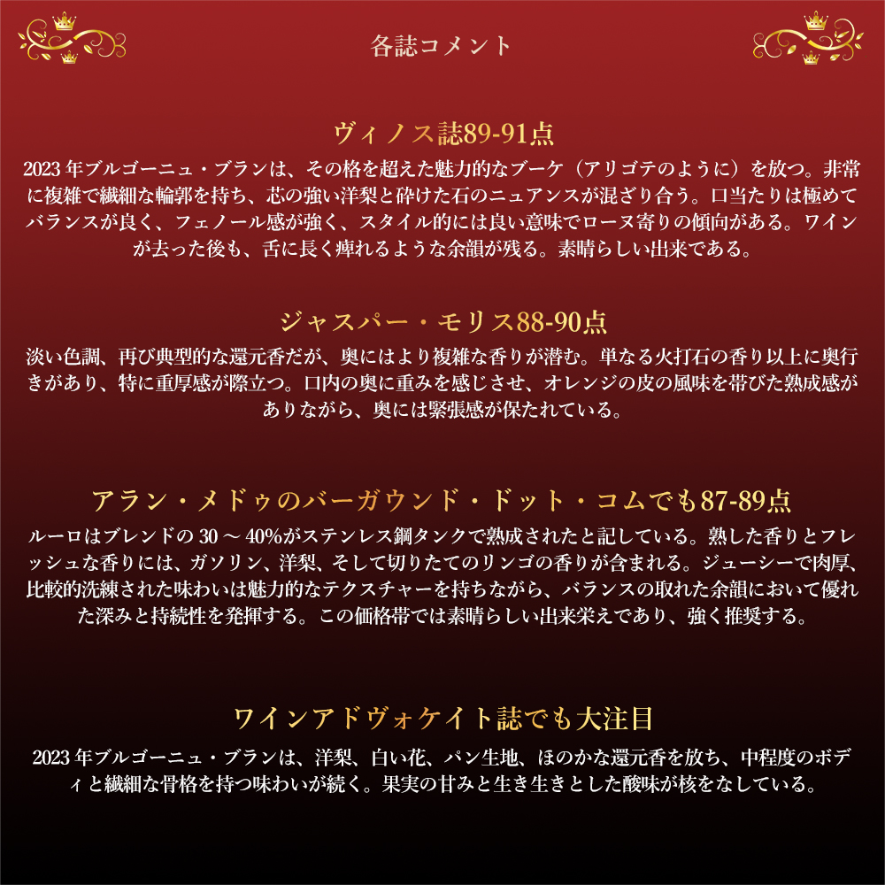 【商品説明】フランス高級ブルゴーニュ辛口白ワイン愛好家大注目!今や、コント・ラフォンやコシュ・デュリに続くムルソー最高の造り手のひとり!であり、英国のM.Wクライヴ・コーツ氏に3つ星生産者に選ばれ、イギリスの評価誌「ザ・ワインズ・オブ・バーガンディ」でDRCやルロワと共に3つ星に選ばれた、今やフランス国内でも引き合いが強く入手困難な大人気造り手のひとり!ドメーヌ・ルーロ!による究極スーパー・ブルゴーニュ・シャルドネ!しかも大人気グレイトヴィンテージ[2023]年もの (アシェット・ガイド誌2026年版でも17/20点&RVF誌2026年版で94点) のグレイトヴィンテージ[2023]年もので遂に少量入荷! このスーパーグレイト2023年でヴィノス誌89-91点でコメントは「2023年ブルゴーニュ・ブランは、その格を超えた魅力的なブーケ(アリゴテのように)を放つ。非常に複雑で繊細な輪郭を持ち、芯の強い洋梨と砕けた石のニュアンスが混ざり合う。口当たりは極めてバランスが良く、フェノール感が強く、スタイル的には良い意味でローヌ寄りの傾向がある。ワインが去った後も、舌に長く痺れるような余韻が残る。素晴らしい出来である。」と大注目! ジャスパー・モリス88-90点でコメントは「淡い色調、再び典型的な還元香だが、奥にはより複雑な香りが潜む。単なる火打石の香り以上に奥行きがあり、特に重厚感が際立つ。口内の奥に重みを感じさせ、オレンジの皮の風味を帯びた熟成感がありながら、奥には緊張感が保たれている。」! さらに今やパーカーを凌駕する勢いのアラン・メドゥのバーガウンド・ドット・コムでも87-89点で、Outstanding Top valueの高評価で、コメントは「ルーロはブレンドの30~40%がステンレス鋼タンクで熟成されたと記している。熟した香りとフレッシュな香りには、ガソリン、洋梨、そして切りたてのリンゴの香りが含まれる。ジューシーで肉厚、比較的洗練された味わいは魅力的なテクスチャーを持ちながら、バランスの取れた余韻において優れた深みと持続性を発揮する。この価格帯では素晴らしい出来栄えであり、強く推奨する。」と大注目! ワインアドヴォケイト誌でもこの2023年に「2023年ブルゴーニュ・ブランは、洋梨、白い花、パン生地、ほのかな還元香を放ち、中程度のボディと繊細な骨格を持つ味わいが続く。果実の甘みと生き生きとした酸味が核をなしている。」と大注目! 外観は輝きのあるイエローの色調!グレープフルーツや白桃などの果実のアロマに、ハチミツや白い花を思わせる香りが立ち上ります!口に含むと感じられる、厚みのある柑橘系の果実味と生き生きとした酸味が印象的!フィニッシュには、透明感のあるミネラル感を伴った心地良い余韻が続きます!ブルゴーニュ・ブランにもしっかりとルーロの洗練されたスタイルが反映された1本! (本当にACブルゴーニュかと驚く出来栄え!ほんのりと樽香、華やかなフルーツの香り、そしてトロミを感じるほどの濃度!それもそのはず、ここだけの話ですが中身はほとんどムルソーらしいのです!畑はムルソーに接する位置、違いとは樽熟成がほんの少し短いこと!) ブルゴーニュ愛好家垂涎の銘醸ルーロの大人気スーパー・ブルゴーニュ・ブラン!しかも大人気スーパーグレイトヴィンテージ[2023]年ものが限定で極少量入荷!