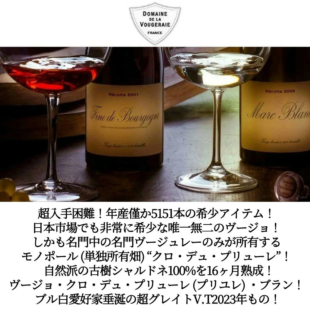 【商品名】ヴージョ・クロ・デュ・プリューレ(プリユレ)・ブラン・モノポール畑[2023]年・蔵出し品・ドメーヌ・ド・ラ・ヴージュレー元詰・自然派・ビオディナミ(エコセール認定)&ビオ(ユーロリーフ認証)・AOCヴージョ・ブラン・年産わずか5151本のみ・自社畑100%・正規品【英名】Vougeot Clos du Prieure Blanc (Monopole) 2023 Domaine de la Vougeraie AOC Vougeot Blanc