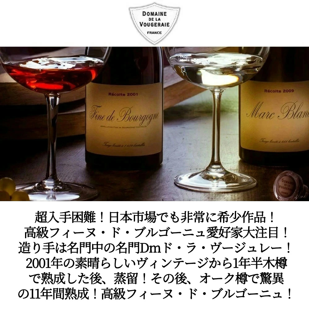 【商品名】【木箱入】ドメーヌ・ド・ラ・ヴージュレー・フィーヌ・ド・ブルゴーニュ[2001]・入手困難な作品のひとつ・ドメーヌ・ド・ラ・ヴージュレー元詰・フィーヌ・ド・ブルゴーニュ(オー・ド・ヴィー・ド・ヴァン・ド・ブルゴーニュ)・正規品・アルコール度数41.5%【英名】FINE de Bourgogne 2001 Domaine de la Vougeraie (Eau de Vie de Vin de Bourgogne)