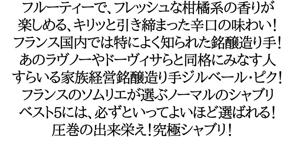 【商品説明】完全数量限定!フランス・ブルゴーニュ辛口白ワイン愛好家大注目!最も人気のある辛口白ワイン!フルーティーでフレッシュな柑橘系の香りが楽しめる、キリッと引き締まった辛口の味わい!の究極人気シャブリ!造り手は、ル・クラスマン「デ・メイユール・ヴァン・ド・フランス」や「ル・ギド・アシェット・デ・ヴァン」などに掲載され高い評価を得ている! フランス国内では特によく知られており、ジャン・マリー・ラヴノーやルネ・ヴァンサン・ドーヴィサらと同格にみなす人すらいる!フランスのソムリエが選ぶノーマルシャブリベスト5には、必ずといってよいほどピク家が選ばれる!また、ヒュー・ジョンソン「ポケットワインブック2019」にてシャブリの最高の生産者として掲載される人気造り手!から「ヴィノス2023.7」89-91点獲得!シャープでキレのある酸!無駄をそぎ落とした綺麗な果実味で定評!のドメーヌ・ジルベール・ピク家から区画ごとに醸造したタンクを試飲して、ブレンド! ほのかに緑がかった透明感のある色合い!香りの凝縮度が高く、グレープフルーツ、ライム、蜂蜜の香りと、鉄をなめているかのようなミネラル感があります!酸味は爽やかでライムを搾ったような印象!さわやかにしまったフレッシュな味、口の中に広がるアロマの大人気辛口シャブリ!ネゴシアンのシャブリとは一線を画す家族経営の造り手による人気シャブリが限定で少量入荷!