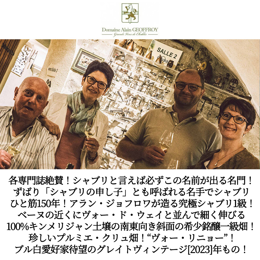 【商品説明】高級シャブリ一級愛好家大注目!ブルゴーニュ高評価辛口白ワイン愛好家大注目!世界的にシャブリの需要が急増!有名ドメーヌの優良シャブリの入手が難しくなっています!しかもブルゴーニュワイン委員会は「白と赤の両方で、美しい香りのプロファイルを備えた、表現力豊かでフルーティなワインが生まれた」と大注目し、生産者も『今年は白ワインにとって素晴らしい年!』と絶賛するグレイトヴィンテージ[2023]年もので待望入荷! 中でもシャブリと言えば必ずこの名前が出る名門中の名門!シャブリの優秀な生産者として名高い「アラン・ジョフロワ」!ゴーミヨ誌3つ星!ヒュー・ジョンソン氏大注目!女性初のマスターオブワイン、セレナ・サトクリフ女史に到っては「壜の中でも良くもつし、少し寝かせればそれだけ良くなる。私はここのワインスタイルが良くて生き生きしている点が好きだ。この特徴でシャブリだとすぐ分かる」と「ブルゴーニュ・ワイン」のなかで大絶賛!しかもGuide Dussert-Gerber des Vins で、なんと!このドメーヌ・アラン・ジョフロワが、シャブリジェンヌなどを押さえて1ers Grands Vin Classesのひとつに選出され、4銘柄を掲載! 大注目の超人気造り手!ドメーヌ・アラン・ジョフロワによる、このシャブリ・プルミエ・クリュ・一級“ヴォー・リニョー”は、スラン川の左岸!ベーヌ村に位置し、石灰質土壌が多い土壌のため、シャブリ一級の中でもミネラル感が強く、しかも畑が真南を向いていないため香りや華やかさが控えめながら、引き締った果実香と火打ち石、鋼鉄にミネラル感、ぎっしり!のまさにシャブリ一級!という名にふさわしい切れの良さと美しい酸!と、かすかに塩見さえも感じさせるミネラル感たっぷりの男性的なシャブリ一級!ベーヌの近くにヴォー・ド・ウェイと並んで細く伸びる100%キンメリジャン土壌の南東向き斜面の人気一級畑!珍しいプルミエ・クリュ・ヴォー・リニョー! 南東向きの最上の畑からの厳選シャルドネ100%をステンレスタンクおよびオーク樽 8ヶ月熟成で造られるこの一級シャブリのヴォー・リニョーは、他のシャブリと比べ、非常に凝縮した果実味と、まろやかでミネラル分に富んだ味わいが引き出され、華やかな香りと引き締まったドライな口当たりは注目に値します!柑橘や白い花の華やかな香りが広がるエレガントなアロマ!口当たりはクリーンで繊細、シャブリらしいフレッシュな酸味としっかりとしたミネラルが果実味と見事に調和した究極辛口白ワイン!しかも最新ヴィンテージでグレイトヴィンテージ[2023]年もので遂に入荷!シャブリ一級ファン垂涎の逸品が限定で極少量入荷!