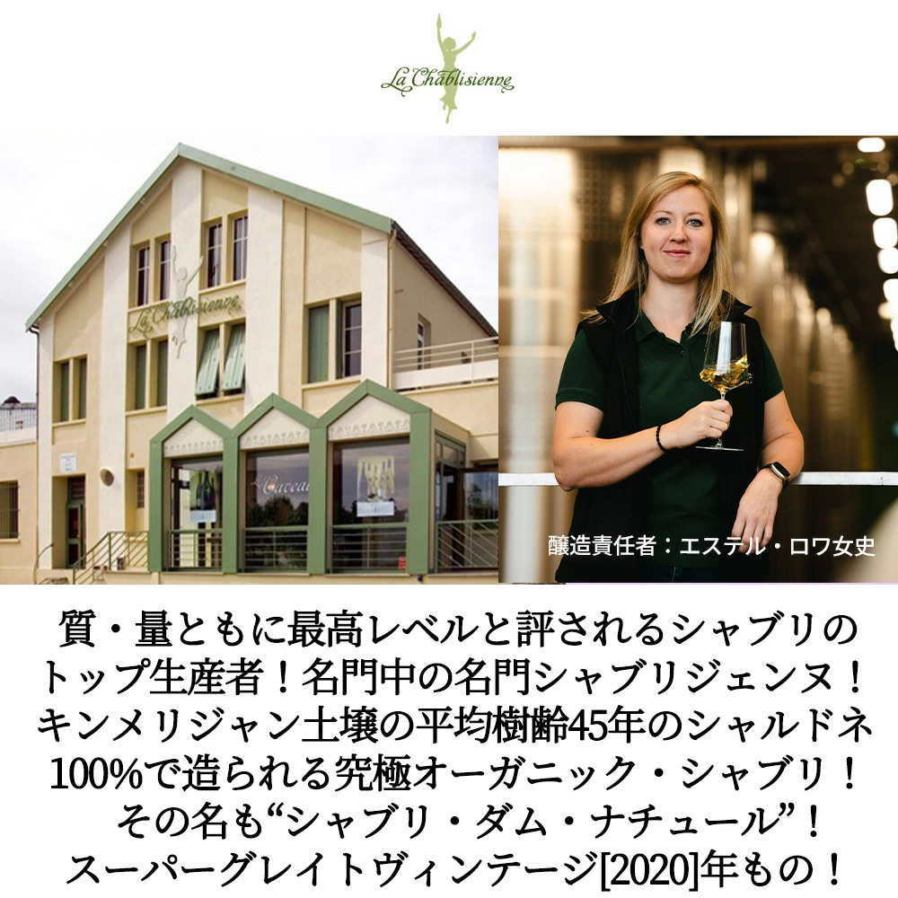【商品説明】大人気!フランス・ブルゴーニュ辛口白ワイン愛好家大注目!銘醸シャブリジェンヌより新アイテム“ダム・ナチュール”オーガニック・シャブリが登場! ブルゴーニュ高級辛口白ワインの中でも最も人気のある辛口ワインのひとつ!フルーティでミネラル感があって、フレッシュな柑橘系の香りが楽しい、キレのある引き締まった辛口ワイン! しかも愛好家待望のスーパーグレイトヴィンテージ[2020]年 (アシェット・ガイド誌2023年版でもブルゴーニュの白に18/20点の高評価&RVF誌96点の高評価) でついに少量入荷! しかも造り手は、ロバート・パーカー★★★★4つ星生産者であり、アシェット・ガイド誌2015年版でも2銘柄が掲載!ベタンヌ&ドゥソーヴ2015年版でW★★スター獲得! 厳しい評価で知られるル・クラスマン誌は「以前から驚くほど品質が安定しており、難しい年でも例外はない。いずれも口当たりの良い健全な味のワインで (つまり収穫時の実の選別がきちんと行われているということである) 、全体としてはきわめて繊細な造りであり、樽の使い方も見事である。このドメーヌのシャブリ・プルミエ・クリュを置いているレストランやブラッスリーは少なくないので、見つけたら迷わずお試しいただきたい。特級クラスのワインの中で特にお勧めしたいのは、純粋で洗練された味わいの『モン・ド・ミリュー』とこのドメーヌの看板である『シャトー・グルヌイユ』である。ワインは完璧な造りで長い余韻と奥深い味わいが楽しめる。」と絶賛!の★星付の人気造り手! 質・量ともに最高レベルと評されるシャブリの造り手が造るオーガニック・シャブリ! 2003年からシャブリ地区の南側、11区画にて有機栽培を実践しており、遂にその区画からのワインが2017年よりリリース! キンメリジャン土壌からの平均樹齢45年のシャルドネ100%を果実味を残すため発酵も熟成もすべてステンレスタンク6ヶ月熟成で造られる究極辛口白ワイン! 強い輝きを持つ明るいゴールドの色調!香りの第一印象はみずみずしい白い果実のアロマ!グラスを回すとミネラル香が加わり見事に調和!味わいはフレッシュでエレガント!心地よいミネラル感が余韻にいつまでも続く美しいシャブリ!銘醸シャブリジェンヌの究極オーガニック・シャブリのスーパーグレイトヴィンテージ2020年が正規品で限定で少量入荷!