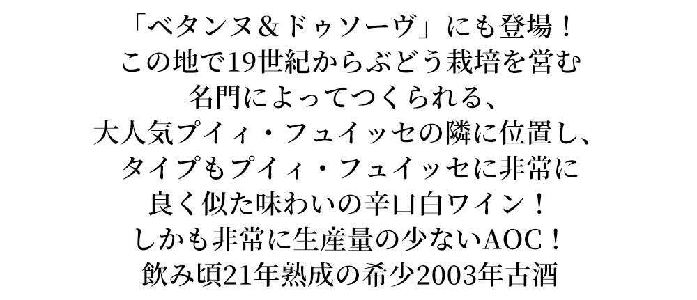 ■ 使用品種:シャルドネ100%■ 樹齢:平均樹齢驚異の50年 ■ 熟成情報:オーク樽12ヶ月熟成 日本では非常に珍しい辛口白ワイン!大人気プイィ・フュイッセの隣に位置し、タイプもプイィ・フュイッセに非常に良く似た味わいの辛口白ワインでプイィ・ヴァンゼルの名で市場に出ることが多い。 しかも非常に生産量の少ないAOC!しかも希少な蔵出しの、しかもドメーヌものの、しかも14年熟成!バックヴィンテージ! この2003年のプイィ・ロシェは、粘土石灰質(鉄分を含む)の3haの畑からの10区画からの平均樹齢驚異の50年のヴィエイユ・ヴィーニュ(V.V)のシャルドネ100%をオーク樽12ヶ月熟成で造られるミネラル感たっぷり!熟した柑橘類の香りに、白い花やナッツ、ほのかにフルーツのニュアンス!素晴しい飲み頃を迎えた究極辛口プイィ・ロシェ! |
