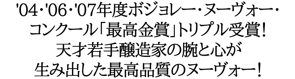 ![]() パルドン家は1820年より続く家族経営のワイン生産者です。現六代目醸造長エリック・パルドン氏は天才の呼び声高く、彼の作り出すワインは数え切れないメダルの受賞を果たし、賞賛を欲しいままにしております。 ![]() 2004年度にはボジョレー・ヴィラージュ・ヌーヴォー・コンクールでたった2本にしか与えられなかった「特級金賞」を受賞。そして昨年の2006年ヴィンテージで再び最高金賞の栄誉に輝きました。 さらに昨年の2007年も最高金賞を受賞しトリプル受賞の栄誉に輝いています。 ![]() 【受賞実績】パルドン・エ・フィス社のワインは、パリやマコン、ヨーロピアンマスターその他、毎年数々のコンクールでゴールドメダルを受賞しています。2004年と2006年、2007年のボージョレー・ヌーヴォー・コンクールでは「パルドン・エ・フィス社醸造ボージョレー・ヴィラージュ・ヌーヴォー」が金賞のさらに上のランク2本に与えられる“Grande Medaille d'Or”(グランド・メダイユ・ドール)「特級金賞」受賞の栄誉に輝きました。 |