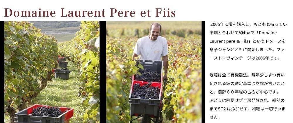 ![]() 「ドメーヌ・ローラン・ペール・エ・フィス」は、ブルゴーニュ屈指の造り手であるドミニク・ローラン氏が息子ジャン・ローラン氏と共に設立し、自然な農法や醸造工程以前の亜硫酸塩無添加など、環境に配慮したワイン造りを実践しています。2006年ヴィンテージから出荷を開始。2007年ヴィンテージは、ラインアップ増加を果たし、ドメーヌとして躍進を続けています。 ![]() 除草剤などの化学肥料は使用せず、自然な農法を実践。葡萄は全房で発酵し、醸造工程以前の亜硫酸無添加、補糖をしないのが特長です。全房発酵により、特に赤ワインは熟成感があり、葡萄の特長を反映した味わいに仕上がります。ムルソーには100年前の垂直型圧搾器を使用し、一部のワインには蝋キャップを施すなど、今でも多くの作業を人の手で行い、昔ながらの造りを踏襲しています。 ![]() 18年契約でヴォーヌ・ロマネのエジュラン・ジャイエ ファミリーのドメーヌを譲り受けました。1993年以降、ニュイ・サン・ジョルジュ・ヴィラージュとプルミエ・クリュ・、シャンボール・ミュジニー、エシェゾー・グラン・クリュ“コンブ・ドルヴォー”に広がるこの素晴らしいドメーヌ、また、クロ・ヴージョ(その0.5haはモーペルテュイに位置する)で造られたワインを買ってきました。アルフレッド・エジュラン72歳、彼は若いときから彼自身、そして彼の父とともにこれらの区画を耕してきました。 ![]() 彼は昔からニュイ・サン・ジョルジュ・プルミエ・クリュの古い畑のとても繊細な木を接木してきました。そのうちエシェゾーだけはマドレーヌ・エジュラン・ジャイエの所有で、それらのすべての木が例外なくとても繊細で古いピノでした。私たちはこれらの畑を、化学薬品を使用せずに耕していくつもりです。これはアルフレッド&マドレーヌ・エジュランがやってきた事であり、そして彼らの助言であり、その畑はビオの資格を得ています。つまり、このやり方は私たち自身が確信を持って私たちの畑でやってきたことと全く同じなのです。これで現在、ドメーヌは9ヘクタールとなります。 |
