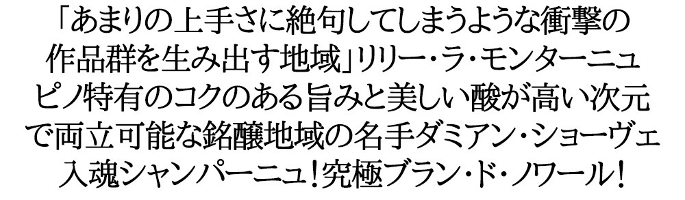 ![]() この造り手に辿り着くまでに5年かかりました。数百軒のRMを訪問する中で分かっていたのは、シャンパーニュで腕自慢の造り手が最も密集している地域は、コート・デ・ブラン最南部のプルミエクリュの村々一帯(シャルドネ)と、モンターニュ・ド・ランス真北部から西側の丘陵地帯(小モンターニュ・ド・ランス)にかけてのプルミエクリュ中心の村々一帯(ピノ・ノワールとピノ・ムニエ)であること。「グランクリュの名前に胡坐をかいている奴らには絶対負けないぞ」という職人のプライドが、あまりのうまさに絶句してしまうような衝撃の作品群を生み出します。 ![]() しかしながら、RMの醍醐味を”個性”に求める時、後者地域の生産者は3品種をブレンドする習慣が根強く、ブラン・ド・ノワールをことごとくプレステージ・キュヴェにしてしまうという問題があります。「あるはずのものが、ない」という葛藤からようやく解放してくれたのが、リリー・ラ・モンターニュの名手ダミアン・ショーヴェでした。 「特定のキュヴェ・プレスティージュ”だけ”が美味しいなど、あってはならない。ここはピノノワールとピノムニエの名産地。これこそを、スタンダード・キュヴェにしなければならない」。 同地域は北向き斜面が多く日照量が多すぎないために、ピノ特有のコクのあるうまみと、美しい酸がそれぞれ高い次元で両立できる、類稀な産地です。「魚介類ももちろん良いが、むしろ肉料理に合わせていただきたい」という”職人”ショーヴェ入魂の作品群、ぜひご堪能下さい。 |