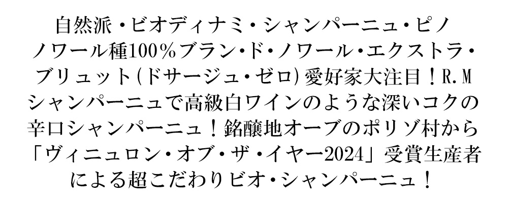【商品名】マリー クルタン シャンパーニュレゾナンス(「共鳴、響き」)ブラン ド ノワール エクストラ ブリュット NV 自然派 ビオディナミ ピノノワール種 【英名】Marie-Courtin Champagne Resonance Extra Brut RM BIO 【商品説明】入手困難!日本市場完全割り当て!自然派・ビオデイナミ・シャンパーニュ・ブラン・ド・ノワール・エクストラ・ブリュット(ドサージュ・ゼロ)愛好家大注目!生産者元詰・R.Mシャンパーニュで高級白ワインのような深いコクの辛口シャンパーニュ!銘醸地オーブのポリゾ村から、女性ビオディナミ生産者(「ビュル・エ・ミレジム」誌主催「ヴィニュロン・オブ・ザ・イヤー2024」受賞者)による超こだわりビオ・シャンパーニュ!当主のドミニク・モロー女史は、「DRC」、「ルフレーヴ」、「コント・ラフォン」らにビオディナミを教えた、巨匠ピエール・マッソンに直接師事!ポリゾ村のR.M.ピオロ・ペール・エ・フィスに嫁いでオーブに来てからは、シャンパーニュにおけるビオディナミの先駆者ジャン・ピエール・フルーリーや、ベルトラン・ゴートロらとの交友を育みながら、マリー・クルタンのドメーヌ名でスタート!小区画からの単一品種でのワイン造り、古樹の尊重、樽発酵といった技法や、「畑の個性を表現したい」という哲学のもと造られるマリー・クルタンによる“レゾナンス”究極ブラン・ド・ノワール!小区画からの平均樹齢30年の古樹(ヴィエイユ・ヴィーニュ)のピノノワール100%(ブラン・ド・ノワール)!ビオディナミ(エコセール認証)100%!エクストラ・ブリュット表記ですが、ドサージュ・ゼロのノンドゼ!キュヴェ名の「レゾナンス」は「共鳴・響き」の意味!とてもクリーミーな口当たりで、高級白ワインのような深いコクがあります!爽快なメンソールの風味は、このシャンパンが真に完成されたものであることを表しています!ドミニク・モロー女史(当店で人気のピオロの奥さん)の自信作!しかも究極ブラン・ド・ノワール!しかも数ヶ月前の現地セラー蔵出しで限定少量入荷! 【タイプ】白 辛口 高級泡 【生産者】マリー・クルタン 【生産地】フランス シャンパーニュ AOC ブラン・ド・ノワール・エクストラ・ブリュット シャンパーニュ 【品種/セパージュ アッサンブラージュ】ピノノワール100% 【内容量】750ml 【JANコード】0103002002451