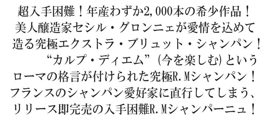 ![]() グロンニェ(グロンニエ)・シャンパーニュ“カルプ・ディエム”・エクストラ・ブリュット・ロウ封印ひも栓・希少蔵出し品・生産者元詰・R.M.・AOCシャンパーニュ・正規品 ■発酵・熟成:木製の大樽で醗酵、その後6ヶ月熟成、マロ発酵なし、ビン熟成もすべてコルク ■土壌:白亜質にやや粘土質が加わる土壌 ■ドサージュ:わずかに0.6g/L 年産わずか2,000本のみの超限定作品! フランスの映画女優のような美人醸造家セシル・グロンニェが、愛情を込めて造るシャンパン! 「子供の頃は木製プレス機が遊び場でした。いつもシャンパンと共にある自分の人生を、誇りに思っています」という彼女! チャーミングな外見からは想像できない、煮えたぎるような情熱と職人根性をもって、畑仕事とシャンパン造りに打ち込んでいます! アシェットガイド誌も激賞!そのほとんどがフランスの超熱狂的個人シャンパン愛好家に直行してしまうため、リリース直後に即完売! グロンニェさんのセラーから特別にお分け頂いた希少シャンパーニュ! |