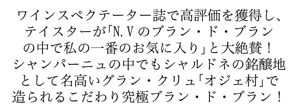 ![]() シャピュイ・シャンパーニュ・グラン・クリュ・特級・ブラン・ド・ブラン・ブリュット・レゼルヴ(グラン・クリュ・オジェ村100%のシャルドネ100%)・シャピュイ家 ■ぶどう品種:シャルドネ100% ■発酵・熟成:ステンレスタンク発酵、瓶内二次発酵!瓶熟36ヶ月後デゴルジュマン!リキュール・デ・エクスペディションは7g/L 輝きのあるゴールド!繊細な泡! フレッシュな白い花をイメージさせるエレガントな香り。 菩提樹の花や西洋サンサジなどの香味深い味わいの人気グラン・クリュ・ブラン・ド・ブラン! 造り手は、シャンパーニュ地方でも特に優れたシャルドネを生み出す銘醸地、コート・デ・ブランのオジェ村に位置する家族経営のワイナリー! シャピュイ家はフランス革命の時代から既にオジェでワイン造りを行い、地元の市長も務めるなど、この地と関わりの深い一族! ![]() ![]() |