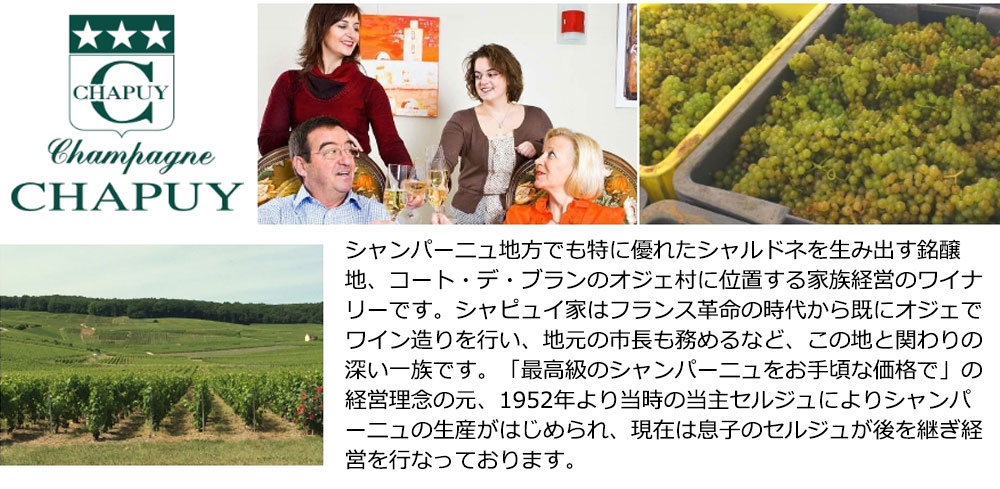 ![]() ![]() シャンパーニュ地方でも特に優れたシャルドネを生み出す銘醸地、コート・デ・ブランのオジェ村に位置する家族経営のワイナリーです。シャピュイ家はフランス革命の時代から既にオジェでワイン造りを行い、地元の市長も務めるなど、この地と関わりの深い一族です。 ![]() ![]() 「最高級のシャンパーニュをお手頃な価格で」の経営理念の元、1952年より当時の当主セルジュによりシャンパーニュの生産がはじめられ、現在は息子のセルジュが後を継ぎ経営を行なっています。 ![]() ![]() シャピュイが畑を持つオジェ村が位置するコート・デ・ブラン地区は、シャンパーニュの中でも特に優れた石灰質土壌で、地表のすぐ下に石灰質が広がります。この石灰質の豊富なミネラル分により、複雑な味わいのシャルドネが生み出されます。 |