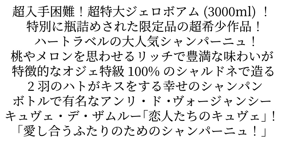 ![]() アンリ・ド・ヴォージャンシーは創業1732年、所有する8ヘクタールはすべてグランクリュ・オジェという、コート・デ・ブランを代表する名門です。「1年のほとんどの時間を畑で過ごしています」というパスカル・アンリは、樹齢40年以上の古樹畑で厳格なリュット・レゾネ栽培に取り組み、極上のブラン・ド・ブランを造っています。 ![]() 世にテーマ・パークやテーマ・レストランは多々あれど、“テーマRM”はここだけです。そのテーマは、「結婚」。ハート型のラベルの中で、フランスで結婚のシンボルとされる鳩のカップルがキスをしているだけではありません。 ![]() このRMには、1820年~1920年当時の結婚をテーマとした博物館が併設されており、記念宝石、家具、調度品、衣装、風習や儀式にまつわる資料が多数展示されています。食堂は、近くの教会で結婚式を挙げたカップルが2次会に使用。その後、当主パスカル・アンリのお父さん自慢の薔薇のコレクションをはじめとする色とりどりの花々に囲まれた素敵な庭で記念撮影。引き出物やお土産にはもちろんここのシャンパンを・・・。 | ![]() ■ぶどう品種:シャルドネ100% ■樹齢:40年以上の古樹畑 ■ドサージュ:6g/l 大型ハートラベルに愛する2羽の白い鳩がキスをする幸せの超特大デカボトル! 桃やメロンを思わせるリッチで豊満な味わいが特徴的はオジェ特級のシャルドネ100%で醸される「愛し合うふたりのためのシャンパーニュ」! 素晴らしい熟成でシャンパン愛好家を魅了するシャンパンのジェロボームサイズ!しかもシャルドネの聖地コート・デ・ブラン! 結婚式の2次会に、銀婚式や金婚式のお祝いに!叙勲祝賀会や企業の創立記念日、セラー開きのお祝いに!あらゆるお祝事に!プレサージュに人気!のハートの大型ジェロボアムボトル! |