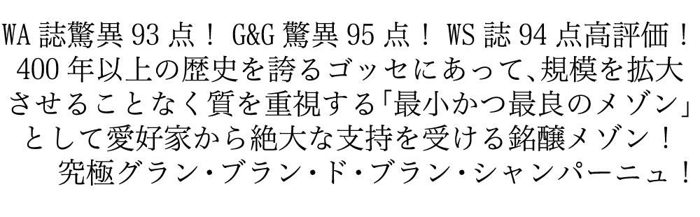 ゴッセ グラン・ブラン・ド・ブラン ブリュット グラン・ブラン・ド・ブランは特級のアイ、シュイイ、クラマン、ルーヴォアに、1級アヴェルネ、マレイユ・シュール・アイ、ヴィレ=マルムリー、トレパイユのシャルドネ100%。コート・デ・ブランのシャルドネ特級と他の地域のシャルドネからは、骨格と繊細なしなやかさを与えている。マロラクティック発酵なし、デゴルジュ前に平均最低36ヶ月の瓶内熟成、ドサージュ8g/L。繊細なグリーンがかった黄金色。白い花や瑞々しい白いフルーツを思わせるアロマにコート・デ・ブランのテロワールを凝縮させたミネラル香。酸とのバランスに優れたデリケートで新鮮な飲み口、優しいシルクのような後味が特徴的。