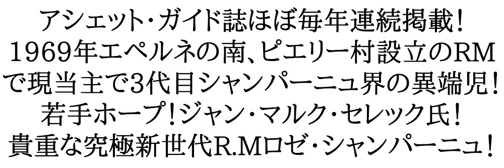 ![]() 以下、インポーターさんの資料より… 独自の醸造法を極め、衝撃的な個性をもってRM(レコルタン・マニピュラン)の存在感を世に示した、アンセルム・セロスやフランシス・エグリら「第一世代」。柔軟な発想によってテロワール表現の可能性を追求し、繚乱の「RMワールド」を花咲かせた、ダヴィッド・レクラパールら「第二世代」。そして最近メディアへの登場が増えてきた「第三世代」の造り手たちは、前世代の求道者たちの偉業に真摯に学びながら、その視線は、「飲んでいかに美味しいか」という原点に、じっと注がれているように感じられます。 ![]() 弊社創業以来のパートナーで、そのクリエイティビティにおいて第二世代を代表するひとりであるシリル・ジャニソンが、「将来、トップクラスのシャンパンの造り手になるから、絶対行ってみた方がいい」と紹介してくれたジャン・マルク・セレックは、第三世代の筆頭格。実際に彼を訪れ、試飲して感じたのは、(もう、トップクラスになっている・・・)。1969年、エペルネ市の南、ピエリー村に設立されたこのRMは、ピノ・ムニエを白眉とする同村の他、ピノ・ノワールの聖地アイの衛星村ディジー、コート・デ・ブランのグラン・クリュを時に凌駕するとさえいわれる、傑出したシャルドネの産地ヴェルテュスの各プルミエ・クリュ村を中心に、12.5ヘクタールの畑を所有しています。1974年に当主となった2代目のリシャール・セレックの下で順調に発展を遂げ、2008年、息子のジャン・マルクが継承したことで、新たなステージを迎えました。 ![]() ジャン・マルクは、それまでのリュット・レゾネ栽培からビオロジー栽培への切り替えを行う一方、一部の区画で馬による耕作を開始。また、父と共に2004年に導入した、小樽による発酵・熟成を深く研究し実践することで、「泡はよりきめ細かくなり、味わいはより複雑に、余韻は何倍も長くなりました」。「スイスの腕時計は華麗で優雅ですが、中の機械は、精緻を極めた職人技の集合体です。官能的で美味しいシャンパンを造るためには、栽培・醸造におけるひとつひとつの仕事すべてを、ミクロン単位でトゥールビヨンを作るように、精密に、正確に行わなければなりません」。「シャンパンが合うべき料理に、完璧に合うシャンパンを造ることを目指しています」(以上、ジャン・マルク・セレック)。 ![]() 「セレック」のシャンパンは、まずその泡の質感と、みずみずしいアロマに驚かされます。口当たりはやわらかく、甘みや酸味、樽熟成させたシャルドネの香味、ミネラルの旨味などが絶妙に溶け合わさって、しっとりと口の中に広がります。ジャン・マルクが言うように余韻の長さも心に残るもので、絶品と呼べる水準に達していると思います。【栽培について】ビオロジー栽培に切り替え中で、2012年現在、6.5ヘクタールは厳格なリュット・レゾネ栽培(化学肥料、除草剤、殺虫剤は一切未使用)、6ヘクタールはビオロジー栽培に転換完了。一部の最重要区画は馬で耕作を行う。 |