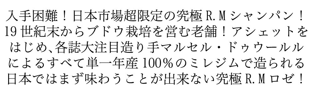 ![]() マルセル・ドゥウールル・シャンパーニュ・ブリュット・ロゼ ■ぶどう品種:ピノ・ノワール50%にシャルドネ40%にわずかにピノ・ブラン10% ■樹齢:樹齢30年以上 オレンジピールやラズベリージャム、トーストとほのかに土の香り、ソフトな赤い果実の風味のドライで素晴しい存在感を示す、日本ではまず味わうことのできない究極R.Mシャンパーニュ! 造り手は、19世紀末からオーブ県のセル・シュル・ウルス村にてぶどう栽培を営む老舗! 1940年にR.Mを設立し、1980年にマルセル・ドゥウールルが継承し、現在の社名に! 現在は息子のブノワ・ドゥウールルに世代交代し、さらに品質・人気ともに急上昇! また、ギィド・アシュットをはじめ専門誌でも掲載され大注目!エスプリにあふれたクリエイティブな作品が多く、特にパリジャンに人気があるR.M! なんと95%はフランス国内の個人愛好家に直行!残りの5%はイタリアやベルギー等近隣のEU各国に輸出!ほぼフランスで完売してしまう希少シャンパン! |