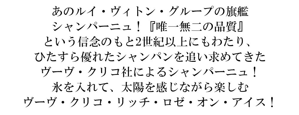 【1772年の創業以来、2世紀以上も変わることなく大胆でスリリングなシャンパンであり続けるヴーヴ・クリコ。 常に最先端の感覚をまとい、真のラグジュアリーブランドとして人々を魅了するそのスタイルは、シャンパーニュ地方で今もラ・グランダム(偉大な女性)と呼ばれるマダム・クリコの「品質はただひとつ、最高級だけ」という信念に導かれています。