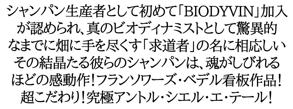 ツィント・ユンブレヒトやシャトー・ド・モンテリーでのビオディナミ修行を終えた息子ヴァンサン・デゾヴォーへの世代交代が近づくベデル。 真のビオディナミストとして驚異的なまでに畑に手を尽くす彼らこそ“求道者”の名にふさわしく、その結晶たる彼らのシャンパンは、魂がしびれるほどの感動作であります。