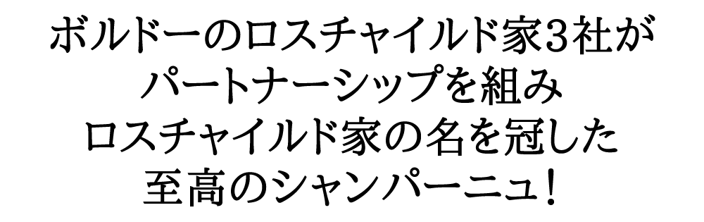![]() シャトー・ムートン・ロスチャイルドを所有する『バロン・フィリップ・ド・ロスチャイルド』、シャトー・ラフィット・ロスチャイルドを所有する『ドメーヌ・バロン・ド・ロスチャイルド』、そしてシャトー・クラーク・ロスチャイルドを所有する『バロン・エドモン・ド・ロスチャイルド』。この世界的に高名なボルドーの三社が、パートナーシップを組み、ロスチャイルド家の名を冠した、至高のシャンパーニュが誕生! ![]() シャンパーニュ・バロン・ド・ロスチャイルドはコート・ド・ブラン地区の中でも最高の区画である特級畑を中心とし、最高の区画から選りすぐったシャルドネを高い割合で使用しています。リザーブワインを40%使用、約4年間もの長い期間熟成させてはじめて世にでる丁寧な製法。各シャトーの公式晩餐会でも振る舞われます。著名なボルドーワインを生み出すロスチャイルド家が新天地シャンパーニュ地方で生みだす、至高のシャンパーニュをぜひお試し下さい。 ![]() ラベルには、5人の兄弟の団結のシンボルとされる5本の矢で有名なロスチャイルド家の紋章の盾(=ロスチャイルド)の部分が用いられています。下の文字は、ロスチャイルド家のモットーである“Concordia,Integritas,Industria”(調和、誠実、勤勉)という名が入っています。 |