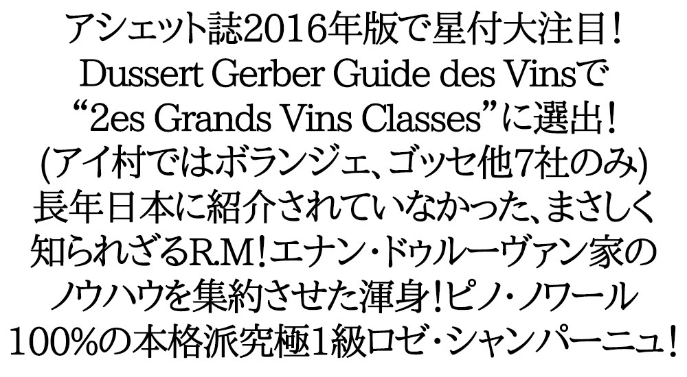 ![]() エナン・ドゥルーヴァン・シャンパーニュ・ プルミエ・クリュ・一級・ブリュット・ロゼ・“ドゥ・セニエ” ぶどう品種:ピノ・ノワール100% 長年日本に紹介されていなかった、まさしく知られざるR.M!しかもフランスワイン権威評価本アシェット・ガイド誌2016年版も大注目!でセレクションのミレジメが★星付で掲載!アシェット・ガイド誌2013年版でもセレクションが★星付大注目!Dussert Gerber Guide des Vins2016年版でも「“2es Grands Vins Classes”」に格付(アイ村での掲載は、ボランジェ、ゴッセ、ルネ・ジョフロワ他7社のみ)する人気シャンパーニュ! 造り手は、グラン・クリュ・のアイ村本拠地でアイ村他6つの村に自然派・リュットレゾネの畑を5ha所有!そのほとんどがヨーロッパの個人シャンパン愛好家とワインバー、レストラン(特にモダンフレンチ系のレストランでオンリスト!)で完売!当主ジャッキー・エナンのフィロソフィーは「シャンパンに求められるエレガンスとミネラル感を大切にすること! |