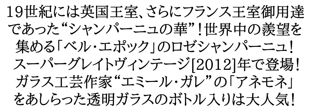 ![]() 1811年、シャンパーニュ、エペルネの地にピエール・ニコラ・マリー・ペリエとその妻アデル・ジュエによって2人の名 前をとってペリエ・ジュエ社は創立されました。 シャンパーニュでも最高のグランクリュを中心に、65haの自社畑を所有しています。1861年にはビクトリア女王御用達となり、さらにフランス王室御用達の命を受けました。英国王室向けシャンパンのオフィシャルサプライヤーとなっています。 ![]() ボトルはアール・ヌーヴォーを代表するガラス工芸作家である「エミール・ガレ」がデザインしたアネモネはあまりに有名です。ペリエジュエは辛口シャンパーニュの先駆者でもあります。19世紀初頭まですべて甘口だったシャンパーニュを顧客の好みに合わせて、糖分添加を行なわないことで他社に 先駆けて初の「辛口」を世に送り出しています。 ![]() ペリエ・ジュエの3代目社長アンリ・ガリスと、エミール・ガレは友人関係にありました。 二人の生きた時代は、まさに「ベル・エポック(美しき優雅な時代)」。生活全体に良質な芸術性を求めたアール・ヌーヴォーが生まれた時代です。 1902年、アンリ・ガリスは、このアール・ヌーヴォーを代表する芸術家、エミール・ガレにペリエ・ジュエのボトルデザイン を依頼しました。当時、既に白血病を患っていたガレは、その2年後の1904年、このボトルが発表されるのを見ることなく、この世を去りました。そしてこのボトルもまた、第一次世界大戦の混乱の中、ガレの死を悼むかのように封印され、その後長い間ペリエ・ジュエの地下カーヴで眠ることになったのです。 ![]() ガレの死から60年後の1964年、当時の社長であったミシェル・ビュダンと、セラーマスターのアンドレ・バブレが、セラーに眠るガレデザインの美しいボトルを発見しました。 セラーマスターは、その美しさに感銘を受け、このボトルにふさわしいシャンパーニュをつくることを決意したのです。「描かれていた白いアネモネの花がシャルドネの持つ繊細さを見事に表現している」と、グラン・クリュのシャルドネを 主体としたスペシャルキュベを醸造、5年の熟成を経て、1969年発表されました。このシャンパーニュこそが、「ベル・エポック」です。アンリ・ガリスとガレが生きた時代の名をつけたこのシャンパーニュは、その繊細でエレガントな味わいと、優美で気品あるボトルデザインが一世を風靡し、「フルール・ド・シャンパーニュ(シャンパンの華)」と称されるプレミアムシャンパンとなりました。 |