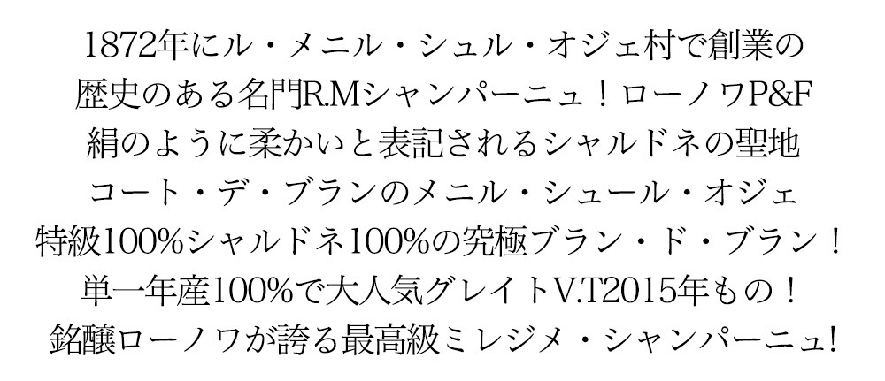 ローノワ グラン クリュ 特級 メニル シュール オジェ100% ミレジム 2015 ブラン ド ブラン100% シャンパーニュ R.M 生産者元詰(ローノワ ペール エ フィス家元詰) AOCグラン クリュ 特級 ミレジム シャンパーニュ