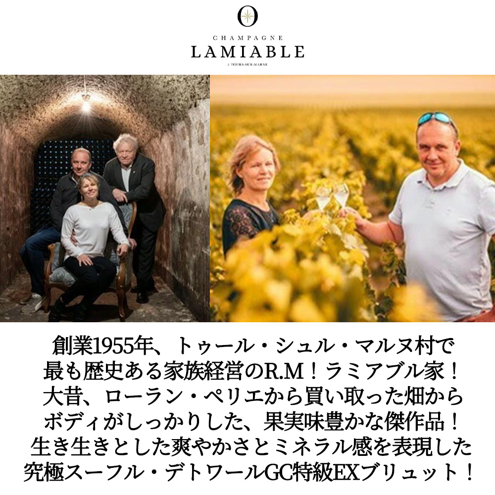 【商品説明】シャンパーニュ辛口愛好家大注目!特級シャンパーニュ愛好家大注目!あのローラン・ペリエも本拠地にするグラン・クリュ産地!トゥール・シュール・マルヌ特級ファン大注目!創業1955年、トゥール・シュル・マルヌ村で最も歴史のある家族経営のR.M!ラミアブル家!現在では約5.7haの畑を所有し、厳格なリュット・レゾネで栽培し、殺虫剤も除草剤も使用せず、有機肥料を使用し、現在はビオ認定申請中!最初にブドウを植えた土地がローラン・ペリエから買い取った (“Les Maslaines”) 畑だというのも一つの逸話!となっている。 フランスワイン評価誌クラスマン誌では「このドメーヌの所有する畑は6haの畑で、全てがグラン・クリュのトゥール・シュール・マルヌにあるが、決して侮ることのできない立派なものである。大手ブランドにも見劣りしない豊潤でふくらみのあるシャンパンが造られている」と大注目!シャンパーニュ愛好家のバイブルと言われるRichard Juhlinの「4000シャンパーニュ」でも3つ星で大注目!ロバート・パーカー氏は4つ星生産者! このスーフル・デトワール (星の息吹の意) は、地球と天をつなぐエレメント「空気」にインスパイアされており、それは風であり、精神であり、生命でもあります!生き生きとした爽やかさとミネラル感を表現!その生産量のほとんどが (90%以上) フランス国内のレストラン中心に販売!国外市場に回るのはほんの極少量と言われています! スーフル・デトワール・グラン・クリュ・ブリュットで、樹齢45年のピノ・ノワール60%にシャルドネ40%!全体の40%のリザーヴワイン使用!20~30ヶ月瓶熟成!ドサージュ4.5g/Lで造られる、本格派特級シャンパーニュ!ピュアでミネラル感があり、調和のとれたクレイジーなほどのエレガンス!イチジクと海塩の香りを思わせる生き生きとした究極特級シャンパーニュが正規品で待望入荷!