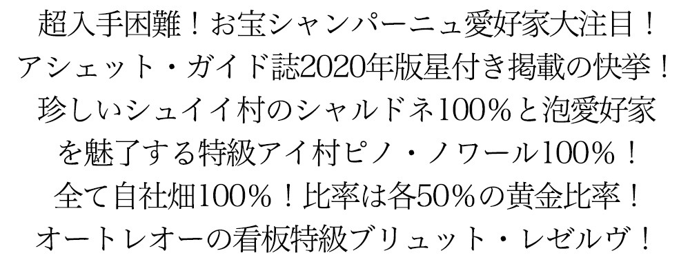 ![]() オートレオー ド シャンピョン GC 特級 ブリュット レゼルヴ シャンパーニュ ヨーロッパのシャンパーニュ愛好家と高級レストランにそのほとんどが直行!日本市場では非常に希少な作品!しかもフランス権威評価誌「アシェット・ガイド誌2020年版」でも、このオートレオーー・ド・シャンピョン・グラン・クリュ・特級・ブリュット・レゼルヴ・シャンパーニュが掲載の快挙!しかも星付き★(シングルスター)で大注目! 環境に配慮したワイン造りで品質・人気急上昇!フランス国内向けのそのほとんどがホテル・レストラン(1スターミシュランのLa brisuetterie、Le Clos(ランスの最も美しいバー)などでもオンリスト!しかも重要輸出国は、ワイン通が多いと言われるベルギーと英国とフィンランドの顧客にほぼ直行! 光輝く微かにマホガニーを帯びた黄金色!力強さとミネラル感、桃やメロン、ラズベリーなどのフルーツを連想させるアロマ! マロラクティック発酵由来の華麗に熟した複雑なヘーゼルナッツや森の香りにバタースコッチやスパイスの強烈な風味までしみ込むようなニュアンスを感じさせます! |
