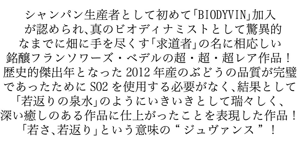 フランソワーズ ベデル シャンパーニュ ジュヴァンス ヴィンテージ 2012 生産者元詰 R.M 自然派 AOCミレジメ シャンパーニュ